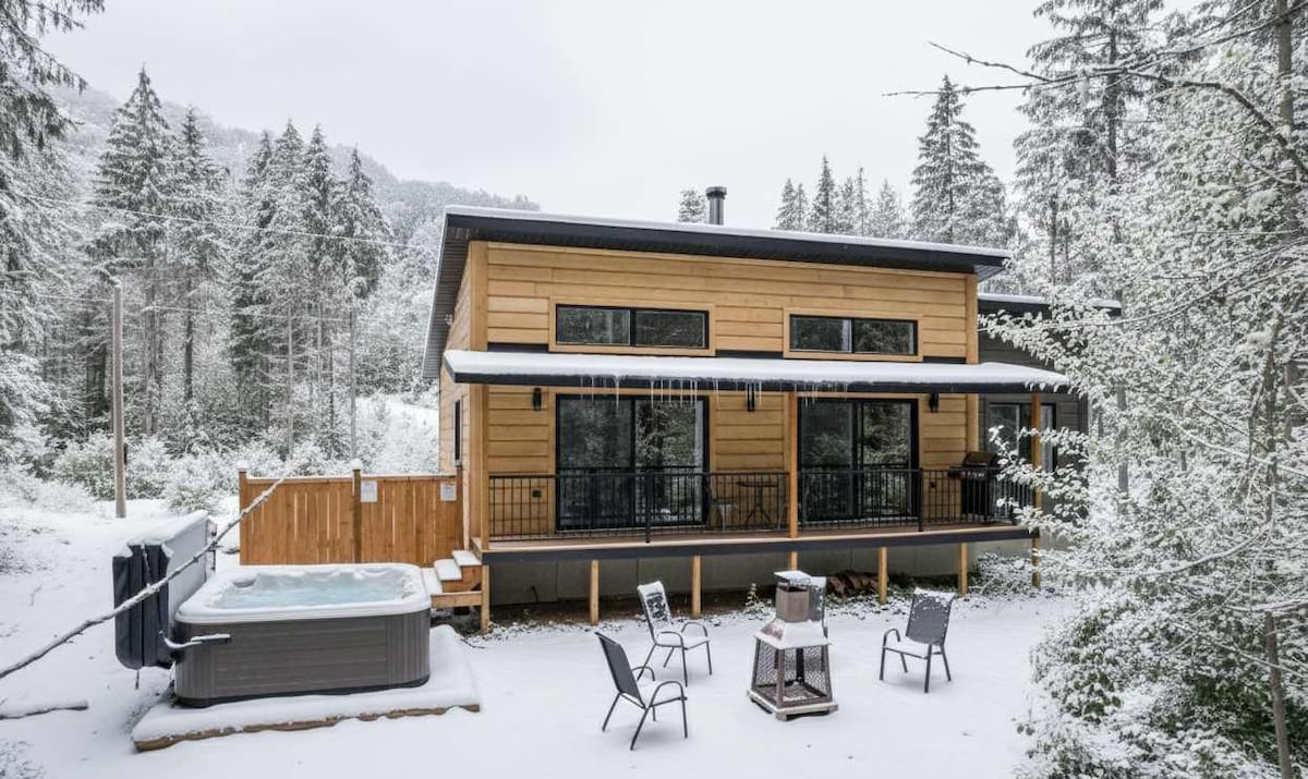 Erleben Sie die Magie des Winters in unserem hochwertigen Chalet & Spa im Herzen des Waldes. Umgeben von Schnee und Ruhe besticht dieses Chalet durch seine hohen Decken, seine spektakulären Fenster und seine warme Atmosphäre. Entspannen Sie im beheizten Spa unter den Schneeflocken, in der Nähe des Innen- oder Außenfeuers. Genießen Sie die Fußbodenheizung, den Wintergrill und das Highspeed-WLAN. 3 Schlafzimmer, 2 Bäder, 6 ultra bequeme Betten. In der Nähe: Wanderwege, Skifahren, Schneeschuhwandern und zugefrorene Seen.