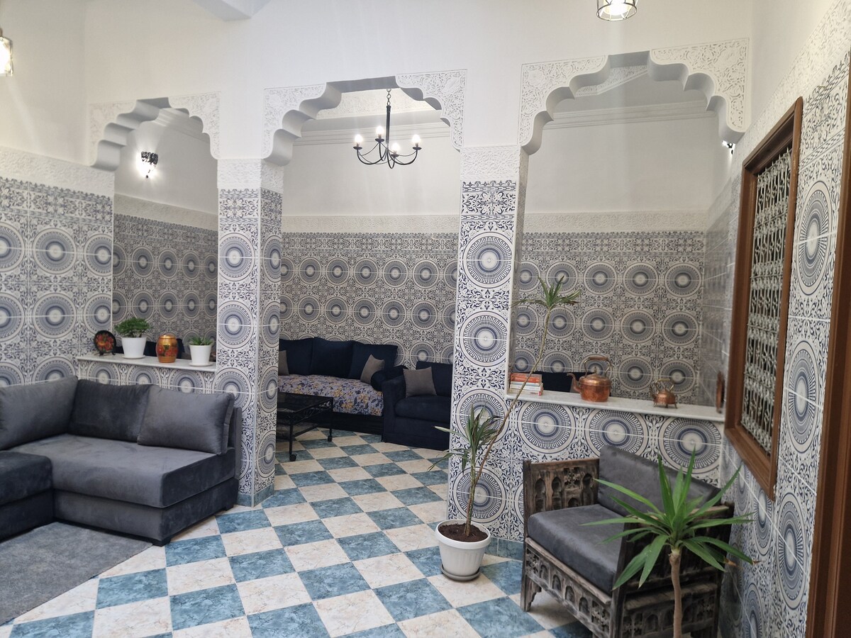 Ce très beau Riad vous accueillera au coeur de la médina de Meknès, à quelques minutes à pied de la place El Hedime. Cette maison typique, entièrement restaurée par des artisans marocains vous propose des chambres décorées dans un style traditionnelle, alliant charme authentique et confort moderne. Le petit déjeuner marocain, composé de Mellouis, Harcha, miel etc. peut être savouré dans les salons ou sur la terrasse offrant une magnifique vue sur la célèbre porte Bab Mansour.