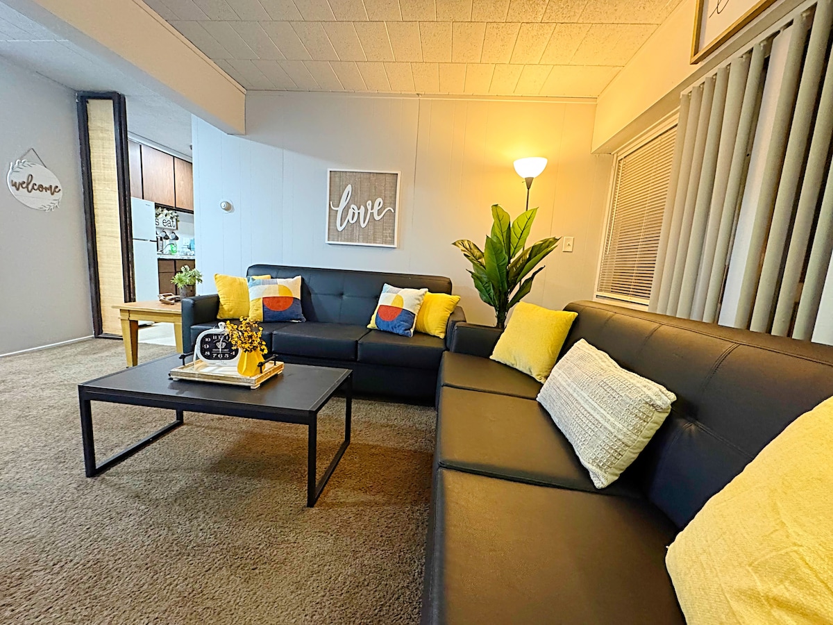 Diese Wohnung befindet sich im Erdgeschoss eines zweistöckigen Doppelhauses. Neu renoviert, einschließlich komplett neuem Badezimmer, Granittheke in der Küche und allen Hartholz- oder Fliesenböden. Smart-TVs in den Schlafzimmern und Smart-TV mit Kabel im Wohnzimmer. Alles, was du brauchst, um Mahlzeiten zuzubereiten, und in der Nähe vieler Restaurants, wenn du das lieber nicht möchtest. Gleich nebenan befindet sich ein Kaffee-Café! Eine Minute zu Fuß zur Bushaltestelle. Nur 5 Fahrminuten von der Innenstadt und 8 Fahrminuten vom Big House entfernt.
