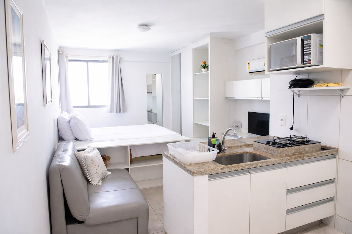 Entspannen Sie sich in diesem ruhigen und stilvollen Raum. Studio im Herzen von Boa Viagem, mit Meerblick. Super belüftet Ideal für fröhliche Menschen, die das Leben mit Stil genießen. Sauberkeit und Komfort sind unser Motto. Wir lieben es, Gäste zu empfangen, wir hinterlassen immer einige Leckereien; Obst, Erdnüsse, Kaffee, Zucker... strenge Kontrolle bei der Reinigung. Als Superhost qualifiziert. Das Gebäude verfügt über einen kleinen Markt für den Kauf von Grundnahrungsmitteln sowie einen Gefrierschrank mit Wasser, Bier, Säften und Softdrinks.