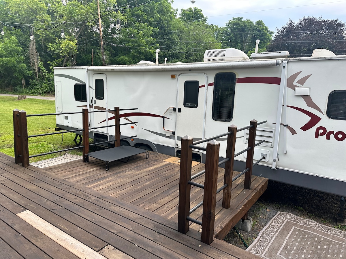 Genieße eine ruhige Umgebung, 3 Meilen vom Beaver Stadium und Downtown State College entfernt. Dieses voll ausgestattete Wohnmobil bietet Strom, Heizung, Klimaanlage, Badezimmer und Küche. Es verfügt über ein Queensize-Schlafzimmer, eine Couch, die in 2 Schlafplätze umgewandelt werden kann, ein Etagenbett und einen Esstisch, der in ein Bett umgewandelt werden kann. Platz für 4-6 Personen. Du hast das gesamte Wohnmobil für dich allein. Bettwäsche, Bettwäsche, Küchenutensilien (einschließlich Keurig, Eismaschine, Töpfe, Pfannen und Utensilien) werden bereitgestellt. Bietet auch einen entspannenden Außenterrassenbereich.