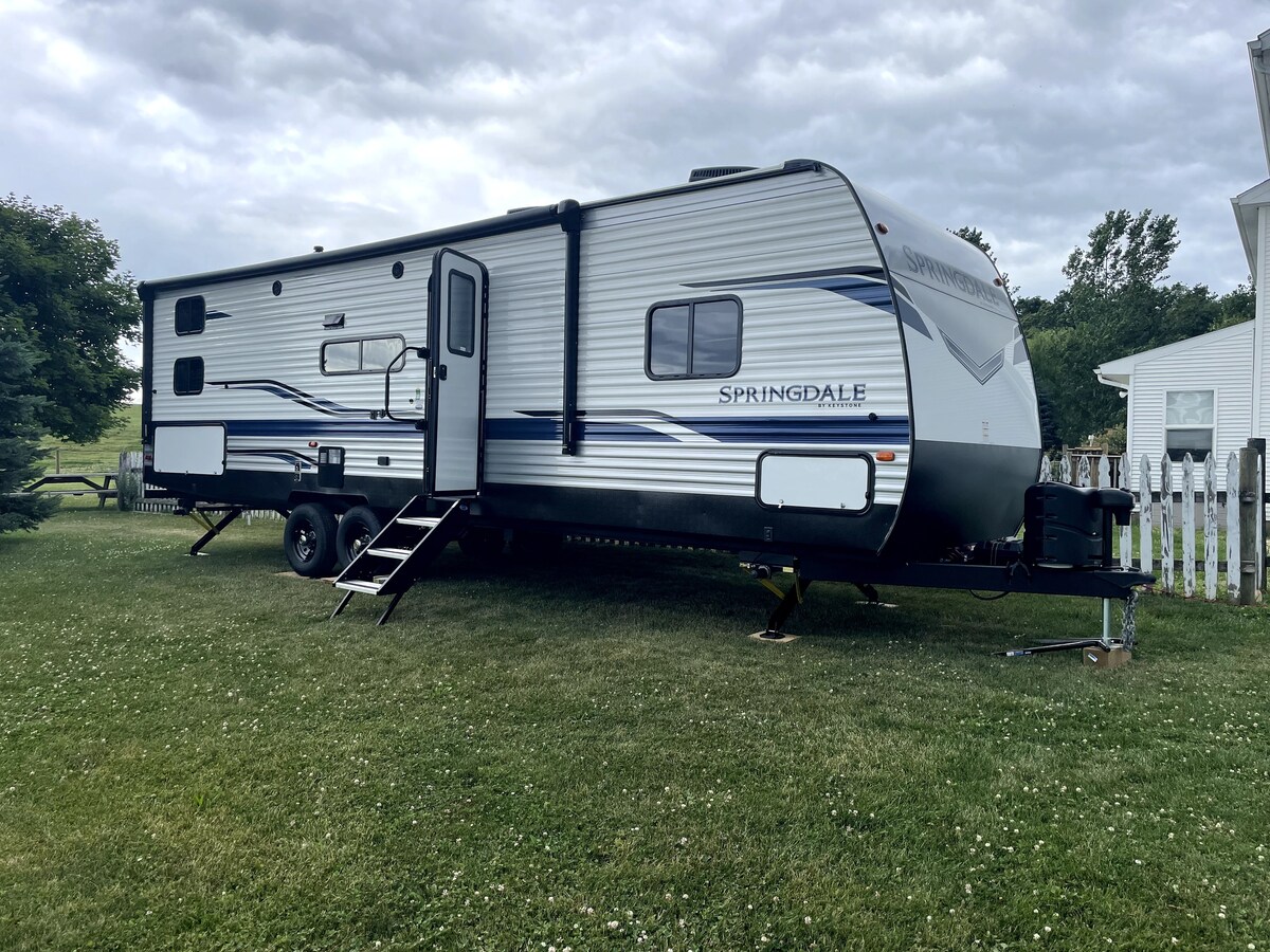 Camper available at the Grange Fairgrounds in Centre Hall, PA Whether you’re here for the PSU games or the events at the Grange Fair, this 2021 camper is perfect for you. Fits up to 6 people and comes with an outdoor set up for fun evenings around the camp fire. Bedding, towels, dishes, pots/pans, and more included. Has one queen bed, two large bunks, one table that’s converts into a twin and one couch that coverts into a twin. Also has a full bathroom and kitchenette with a coffee maker.