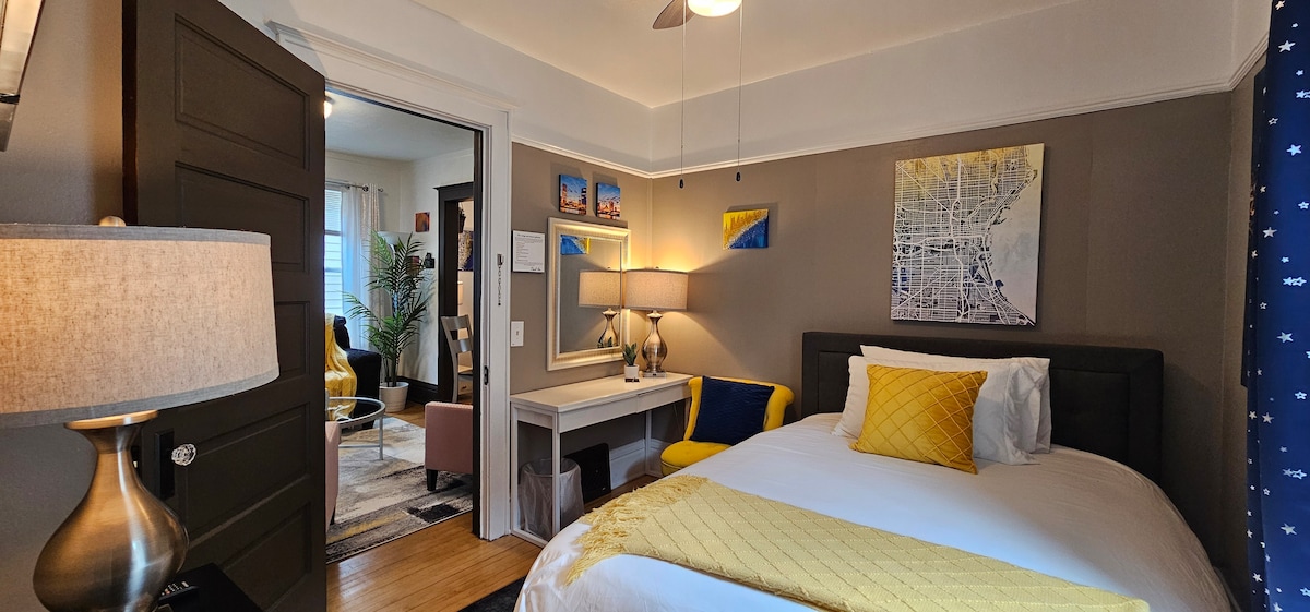 Willkommen in unserem Craftsman-Bungalow von 1924! Unser Backsteinbungalow verbindet den Prairie House-Stil mit den Innovationen des Chicago Craftsman und erwartet deinen Aufenthalt. Du wirst die obere Suite mit eigenem Eingang, zwei Schlafzimmern, Küche und einem kompletten Badezimmer genießen. Neu gestaltete, porzellanmarmorierte Böden inspirieren bei jedem Schritt zu Luxus, zusammen mit dem neuen „Article“-Sitzbereich, 50-Zoll-Fernseher mit Streaming, Bettwäsche und Handtücher aus 100 % Baumwolle, einer Küche voller Annehmlichkeiten und Geräte und üppigem Grün, um die Luft sauber zu halten.