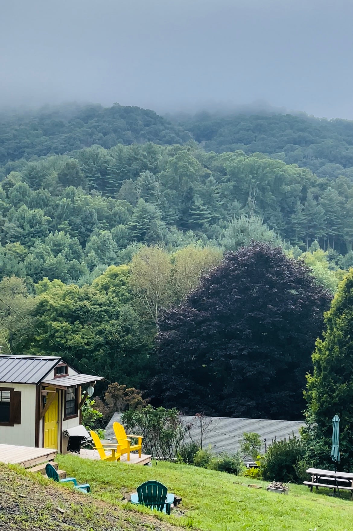 Hütte/Tiny Home. Entspanne dich und genieße die Aussicht auf die Berge, 200 Hektar Wanderwege, Wälder, Weiden, Bauernhof und Felder. HURRIKAN HELENE: DIE WEGE SIND DURCH HELENE DERZEIT NICHT VOLLSTÄNDIG ZUGÄNGLICH. Unsere Wanderwege und Wälder wurden verwüstet, da Hunderte von Bäumen umgestürzt sind. Viele Wanderwege sind immer noch nicht freigeräumt. Unsere 2,4 km lange obere Ridge-Trail-Schleife und ein Fluss-Trail sind jetzt geöffnet. Weiden und Felder sind größtenteils gerodet und alle Bereiche rund um das Ferienhaus sind vollständig gerodet mit herrlichem Fernblick auf Felder und Berge.