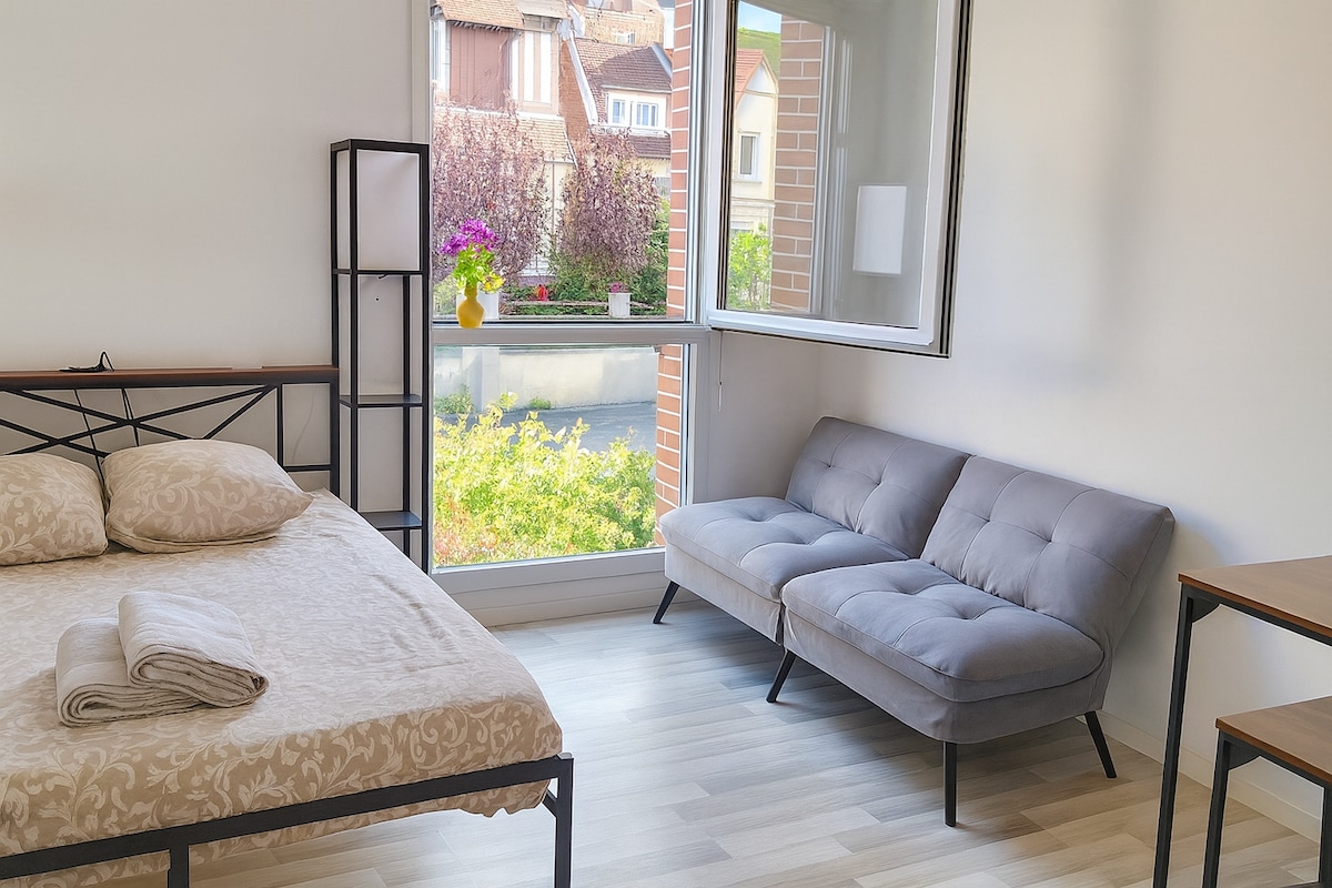 Wunderschönes charmantes Studio, behindertengerecht, 5 Minuten zu Fuß vom Bahnhof Rouen und dem historischen Zentrum entfernt, in einer charmanten Villa. Es ist mit einem Duschbad, einem hochwertigen Queensize-Doppelbett 180 cm, Schreibtisch, einer voll ausgestatteten Küche, Kühlschrank, Backofen, TV ausgestattet. Ein zusätzliches Einzelbett ist auf Anfrage erhältlich (zusätzliche Kosten wenn Sie zu zweit sind (+10 €/Nacht). Ein sicherer Privatparkplatz steht Ihnen kostenlos zur Verfügung sowie WLAN.