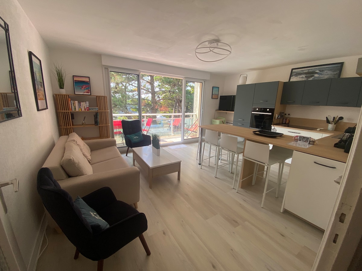 A st jacques sur la commune de Sarzeau, Appartement 1er Étage, lumière traversante et belle terrasse avec une vue imprenable sur l’océan. Le logement comprend une belle pièce à vivre composée : - une cuisine équipée d’une plaque induction, four + micro onde, frigo, grill électrique, bouilloire, cafetière…. - un canapé lit de qualité en 140 - une salle de bain - un Wc séparé - une chambre avec fenêtre : lit 160 de qualité - un garage fermé et un local vélo fermé Logement NON FUMEUR