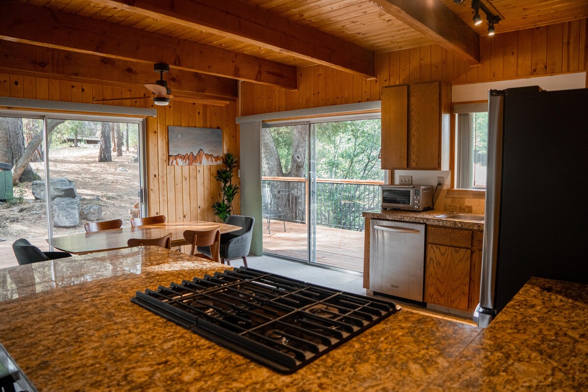 Romance in the Pines ist ein gemütliches, verstecktes Juwel auf 6200 Fuß Höhe, umgeben von 100 Fuß hohen Kiefern und über 300 Jahre alten Eichen. Diese magische 2-stöckige Hütte befindet sich auf einem halben Hektar großen Grundstück mit Kiefern, die direkt durch das große Deck wachsen. Der Innenraum verfügt über rohe Zedernwände, *NEUES Highspeed-Internet*, den gemütlichsten Kamin, mit Teppich ausgelegte Schlafzimmer und große spektakuläre Aussichtsfenster. Du kannst deinen Morgenkaffee im verzauberten Garten trinken und den Sonnenuntergang auf der riesigen Terrasse genießen.