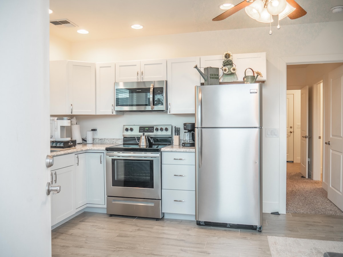 Gönn dir eine Auszeit an der kühlen Luft und unter den Kiefern in dieser Gästesuite mit einem Schlafzimmer. Privater und sicherer Eingang. Komfortables Wohnzimmer, gut ausgestattete Küche, komplettes Badezimmer und Schlafzimmer mit Queensize-Bett. Haustierfreundlich mit eingezäuntem Hof. Ein Ausgangspunkt für alle spektakulären Orte in der Nähe für Tagesabenteuer: Wanderwege, Blick auf die roten Felsen von Sedona, Skifahren oder Snowboarden auf den Pisten des nahegelegenen Snow Bowl Ski Resorts, Grand Canyon Sightseeing oder Entdeckung der Innenstadt von Flagstaff.