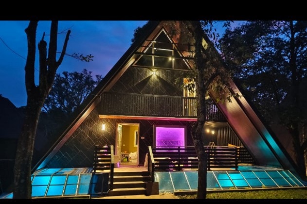 Nestled on a foundation of natural rock ..It's a A FRAME (215 sq ft)structure and a outside area (100 sqft)for campfire and barbeque. Both the deck connects with a 2 metre bridge and the only one in 100 metre circle provide extreme privacy. The property runs on solar so their is no issues on power failure .From road their is a short 80 meters trek to the property makes you feel like you are inside a forest .