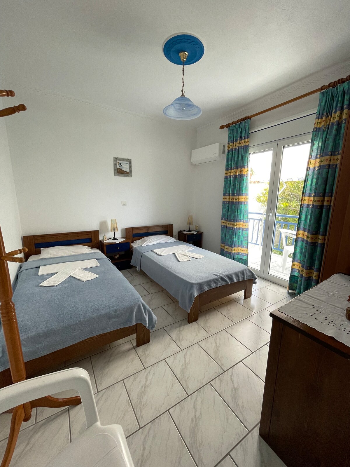 We have a small apartment building with 8 separate units, all with big balcony and beautiful sea view. The rooms are spacious, comfortable and very well located to explore the whole island or just to relax on Karfas beach. Our guests are free to use the swimming pool of a hotel nearby. Bus stops are around the corner and we are close to the airport as well as the main port and Chios town.