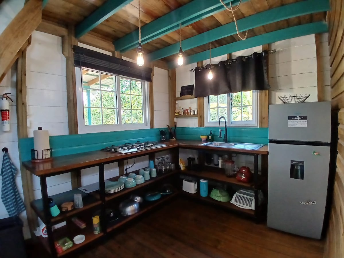Übernachte in einem skurrilen Bungalow unter den Bäumen, der entworfen wurde, um die Außenwelt hereinzubringen. Die Wände des Hauses sind zur Hälfte geschlossen und oben abgeschirmt, was deinen Aufenthalt komfortabel und luxuriös macht, aber voller Natur, weshalb wir alle Bocas genießen. Mit einer voll ausgestatteten Küche, zwei Schlafzimmern mit Queensize-Betten, einem großen Hauptwohnbereich und einer kreativen Stein- und Muscheldusche. Hier kannst du die Stille in der Natur genießen. Von deiner Haustür aus gehst du 50 Fuß zum Meer und entspannst dich oder surfst am Tigertail Beach.