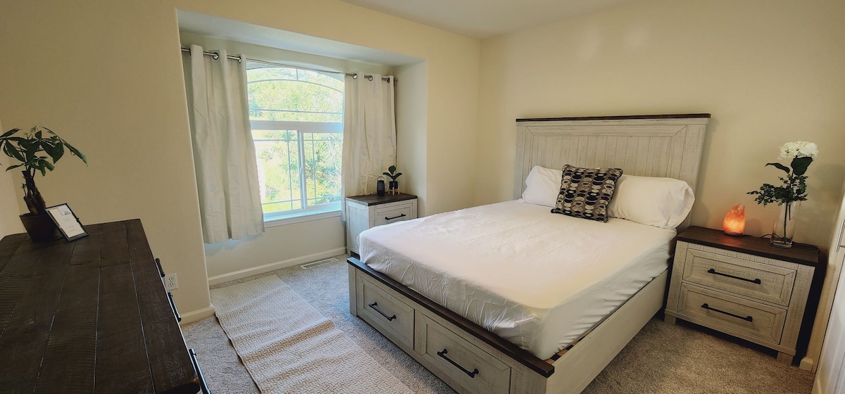 Geräumige, abgeschiedene Suite im Wald mit wunderschöner Einrichtung, 20 Minuten von Harbin Hot Springs entfernt, mit einem Mohagany-Kingsize-Bett, einer Bio-Matratze der Marke Avocado und einem eigenen Bad mit Whirlpool-Jet-Extra-Large-Badewanne! Genieße den ruhigen Blick auf die Natur, einen riesigen begehbaren Kleiderschrank, eine separate Dusche und Doppelwaschbecken. Du hast Zugang zu einer voll ausgestatteten Küche und einem Wohnzimmer (das je nach Buchung mit anderen Gästen geteilt werden kann). Willkommen auf deiner Reise in eine Welt voller Schönheit!