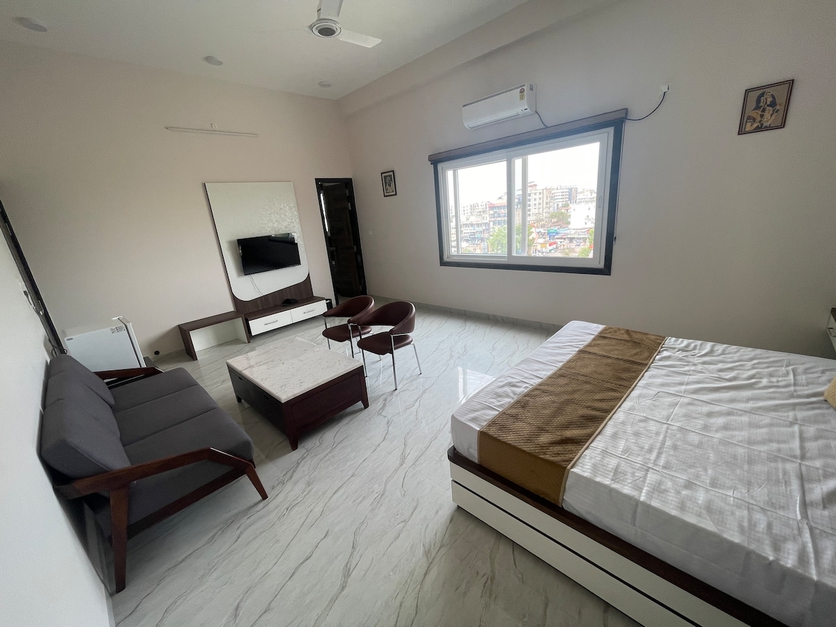 550 Quadratfuß großes Schlafzimmer mit großem Badezimmer (Whirlpool-Badewanne in diesem Badezimmer mit FM, BT, LED-Leuchten, Massagedüsen usw.) und Dampfbad. Große Fenster mit Zimmern mit herrlichem Blick auf die Stadt, die morgens absolut atemberaubend aussieht, fühlt sich an wie ein großes 5-Sterne-Hotel. Moderne Ausstattung, attraktiv eingerichtet und liebevoll für deinen Komfort gepflegt (Split Klimaanlage, TV, WLAN, Kühlschrank, Kleiderschrank, Schminktisch, 3-Sitzer-Sofa, 2 Stühle und Couchtisch befinden sich in den Schlafzimmern)