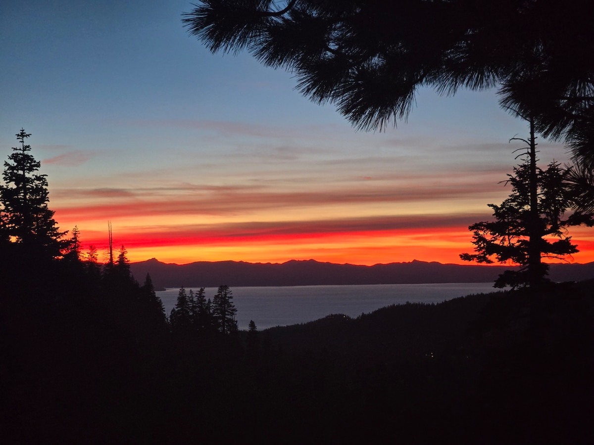Willkommen in deinem Tahoe Retreat! Genieße von der vorderen Terrasse aus einen herrlichen Blick auf die Sonnenuntergänge und die schneebedeckten Berge. Beobachte von der hinteren Terrasse aus die Hirsche und Eichhörnchen, die auf den Hügeln hinter dem Haus nach Nahrung suchen. Nur eine 3-minütige Fahrt zu den Skiliften oder nimm den kostenlosen Shuttle, der vor der Tür abholt. Kein Skifahrer? Wandere auf dem nahe gelegenen Tahoe Rim Trail, erkunde Castle Rock oder fahre 10-15 Minuten zu den Stränden am See oder zum aufregenden Nachtleben im Casino-Viertel. Zentral gelegen zu allem, was Tahoe zu bieten hat.