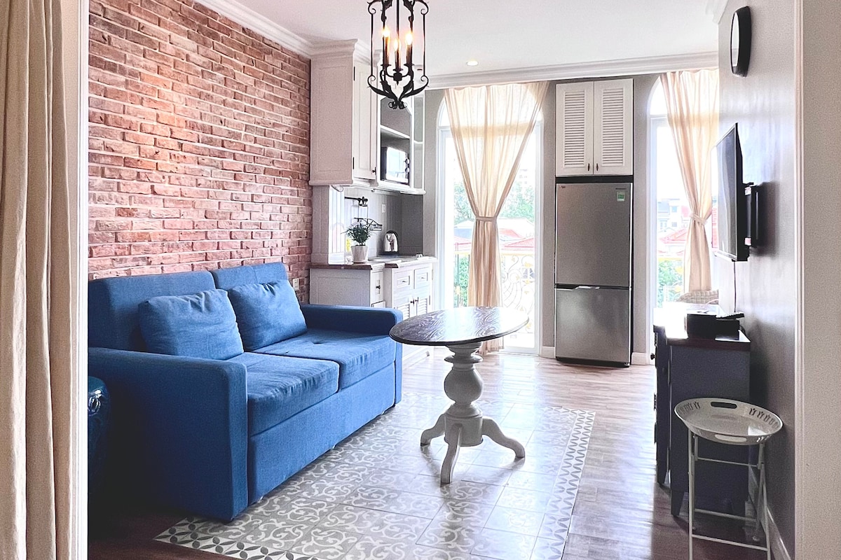 1-Zimmer-Apartment mit zwei Schlüsseln in beruhigenden Matcha-Tönen, das nach anstrengenden Tagen pure Entspannung und Energieerholung bietet. Ein geräumiger Balkon mit Blick auf den Pool und eine üppige Oase, die bei romantischen Sonnenuntergängen am magischsten ist. Im Inneren schaffen eine voll ausgestattete, private Küche und ein gemütlicher Esstisch für zwei Personen den perfekten Ort für ein intimes Abendessen unter warmen Lichtern. Jede Ecke atmet Natur – frisch, ruhig und beruhigend – wie ein privater Rückzugsort im Herzen der Stadt.