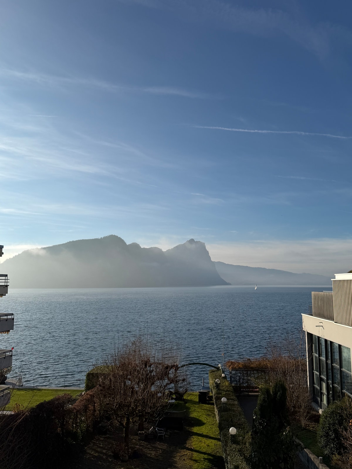 Private Suite auf der Villa mit Zugang zum privaten Seeufer. Grossartige Aussicht. Die meisten touristischen Highlights sind in weniger als 1 Stunde erreichbar. Grosszügiges Schlafzimmer (mit Home Cinema), Panorama Lounge, Panoramaküche, Bad - alles privat genutzt. Bei 3-5 Personen wird ein weiteres privates Schlafzimmer/Bad zur Verfügung gestellt (eine Etage tiefer via Lift). Zugang zu See und Garten. Kinder sind möglich, nur Kleinhunde. Parkplatz, Wifi. Das beliebteste Airbnb der Schweiz.