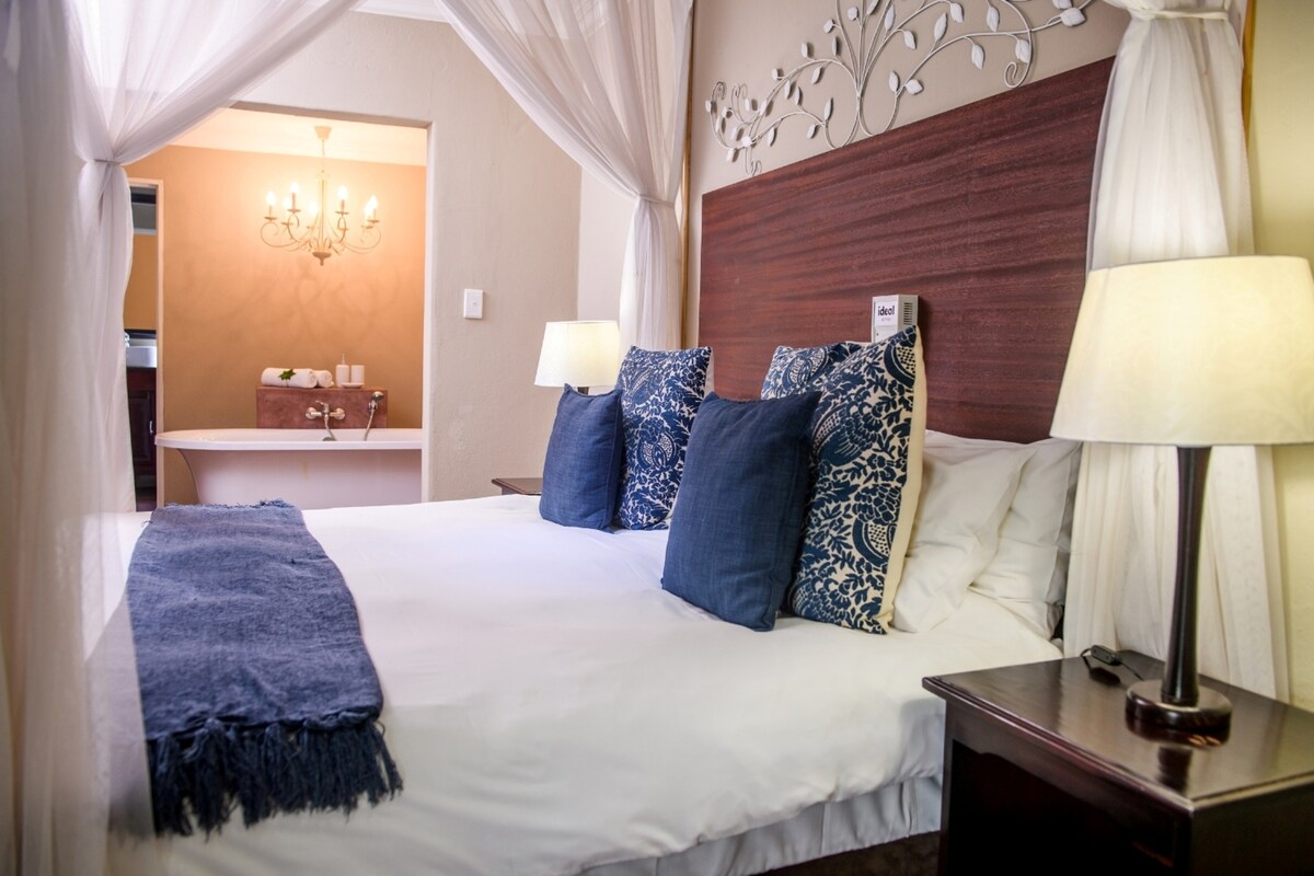 Jedes Luxuszimmer verfügt über ein Kingsize-Bett, eine offene Doppeldusche und eine geschlossene Toilette. Jedes Zimmer verfügt über eine Klimaanlage, einen Fernseher mit DStv, eine Tee- und Kaffeestation, einen Kühlschrank und andere Annehmlichkeiten für Komfort.