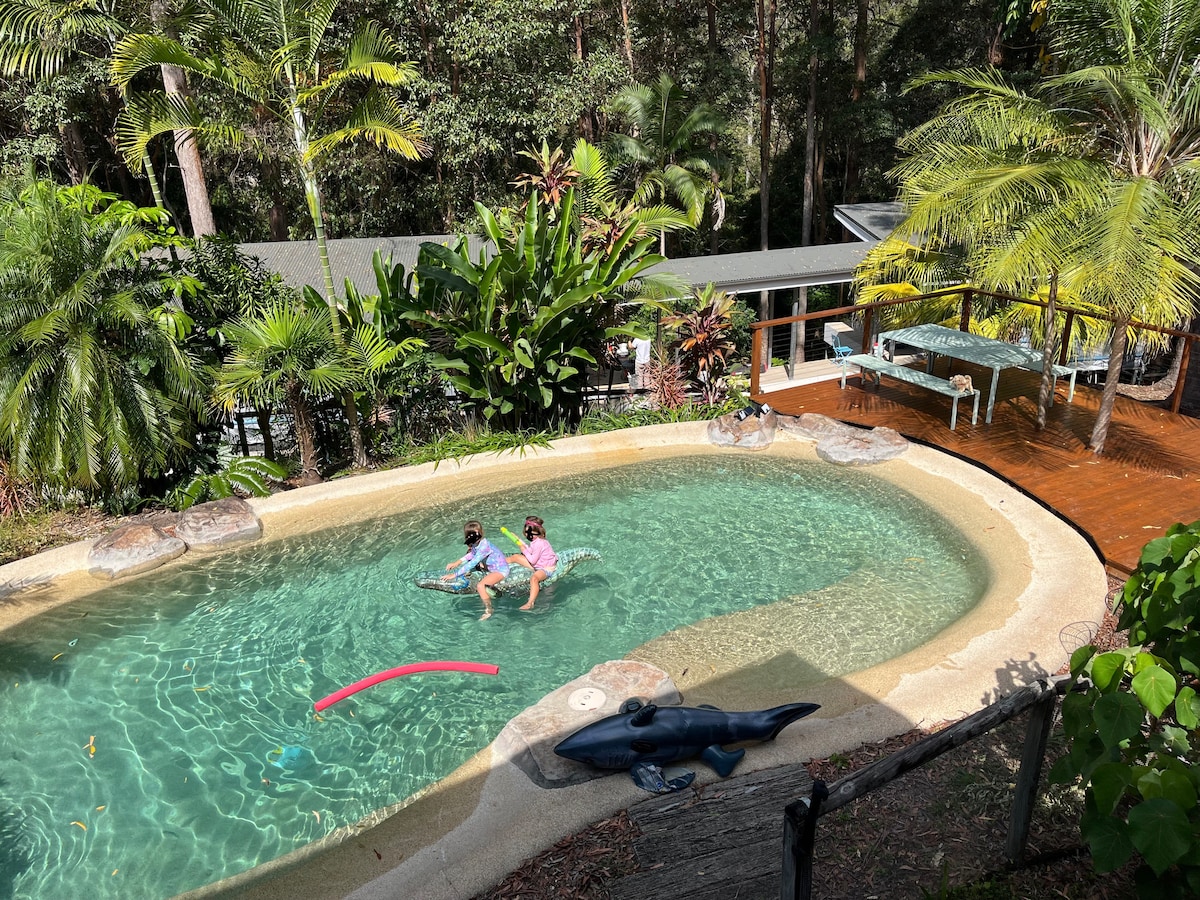 Wir haben eine riesige 100 m2 große Unterkunft im balinesischen Stil geschaffen, die auf über 2000 m2 natürlichem Regenwald für einen ruhigen und entspannten Urlaub sorgt. Sauberes und geräumiges 1 großes Schlafzimmer mit super bequemem Queensize-Bett und Lounge. Wache mit dem Klang der Peitschenvögel auf, beobachte Wasseragamen und eine reiche Vogelwelt vom erhöhten Deck mit Blick auf einen wunderschönen Bach. Das Retreat ist völlig eigenständig. Voll ausgestattete Küche. Klimaanlage mit Umkehrzyklus und Deckenventilatoren. Überdachte Parkplätze an der Straße stehen zur Verfügung.