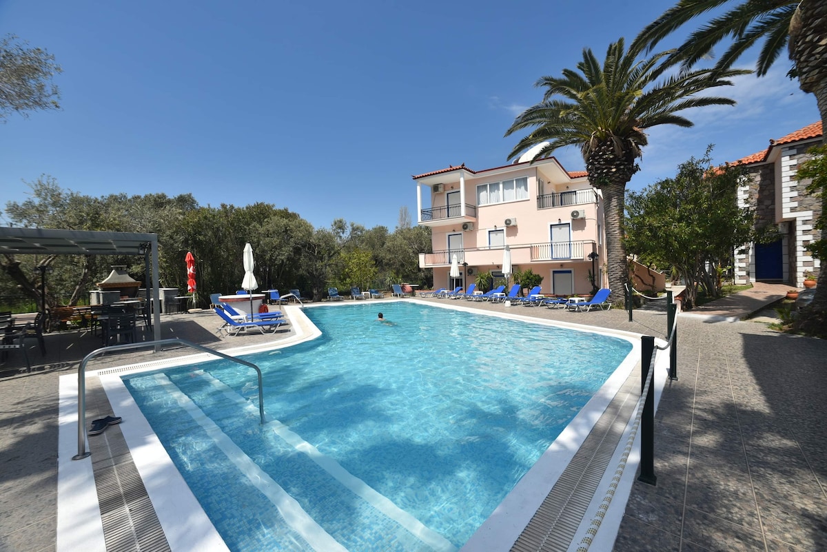 Unser Hotel befindet sich in Skala Eresos auf Lesbos! Alle Apartments bieten Platz für bis zu 4 Personen! Jedes Zimmer verfügt über ein Doppelbett, WLAN, TV, Klimaanlage, eine voll ausgestattete Küche, ein komfortables Badezimmer, einen großen Balkon und einige der Zimmer haben Meerblick. Sie können Ihr Frühstück oder Mittagessen in unserem Hof genießen!!Es gibt auch einen bequemen Parkplatz. Wir sind 300 m vom schönen Strand und den Geschäften entfernt! Haustiere willkommen!