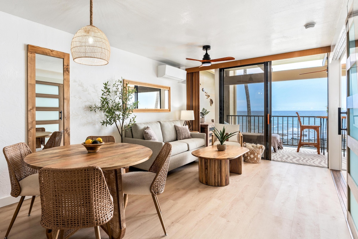 Beste Einheit in Kailua-Konas beliebtem Sea Village und eine der einzigen mit Klimaanlage! Faszinierender Meerblick, Brisen, tropische Sehenswürdigkeiten und Klänge begrüßen dich in dieser leicht zugänglichen Erdgeschosseinheit. Beginne deinen Tag auf der privaten Veranda und beobachte die Spinnerdelfine und beende ihn mit einem Glas Wein und einem Blick auf den Sonnenuntergang über dem Meer. Diese komplett renovierte, schlüsselfertige Eigentumswohnung verfügt über ein offenes Wohnkonzept und liegt 5 Minuten von der Innenstadt entfernt. Ein idealer Ausgangspunkt für Einzelpersonen, Paare oder kleine Familien, um die Big Island zu erkunden!