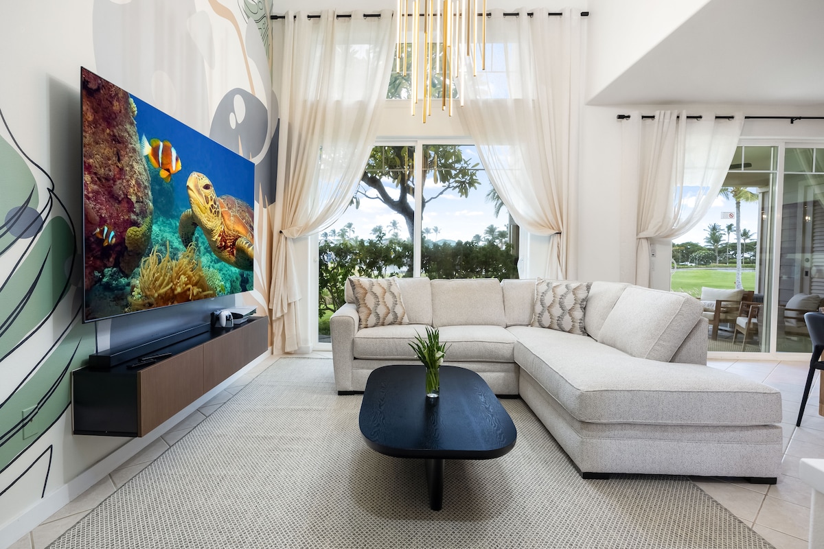Meerseite, übergroß, geschmackvoll eingerichtet und aufgewertet, Eckeinheit im begehrten Mauna Lani Resort. Frisch renoviert von einem Profi-Designer! Sonnenuntergang & Golfblick. Wandmalereien mit hawaiianischem Thema, stilvolle schwarz-weiße Master-Suite mit ebenerdiger Dusche + Badewanne, Kingsize-Schlafzimmer im 1. Stock, 50 Fuß vom Parkplatz (keine Stufen), lustige Twin-/Kingsize-Kombi-Kinderzimmer im Obergeschoss. Voll ausgestattete Küche, Babyausstattung (Hochstuhl, Badewanne), modernes Wohnzimmer, Loft, 2 Bürobereiche, Strandausrüstung, Fahrräder, Spiele, PS5. Komfort & Stil für alle Altersgruppen!
