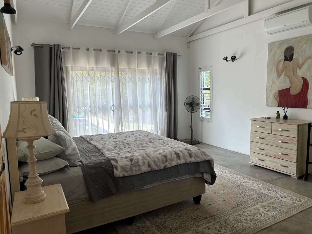 Ein separates Loft zur Selbstverpflegung in einem sicheren, rund um die Uhr bewachten Bereich, privater Eingang, der sich zur privaten Terrasse öffnet. Nur 15-20 Minuten zum Flughafen OR Tambo. Zugang zum Garten und zum Pool. Wir haben Backup-Batterien mit Wechselrichtern während der Lastabwurfzeit. Du hast Licht, DSTV und WLAN während der Lastabwurfzeit PLUS die Verwendung einer speziellen Wandsteckdose für medizinische Geräte. Eine entspannte, einfache Atmosphäre, die sich für Geschäftsreisende oder Urlauber eignet.
