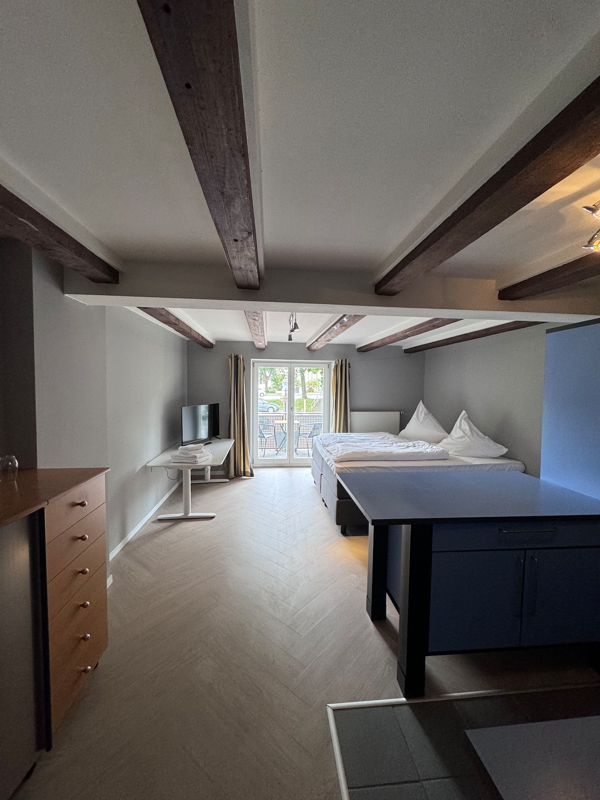 Sie erreichen das gemütliche Zimmer ( über 2 Stufen) im Erdgeschoss des Ferienhauses. Das Fenster ist sichtgeschützt. Das Apartment ist mit einen komfortablen 140mx 200m Bett möbliert. Die Ausstattung beinhaltet einen Fernseher, eine Sitzgelegenheit und ein Kleiderschrank. Das Badezimmer verfügt über eine bodentiefe Dusche/WC, Fön und Handtuchheizkörper. eine Kaffee- und Teestation, Geschirr und Besteck, Becher und Gläser, Ein kleiner Kühlschrank ist auch vorhanden.