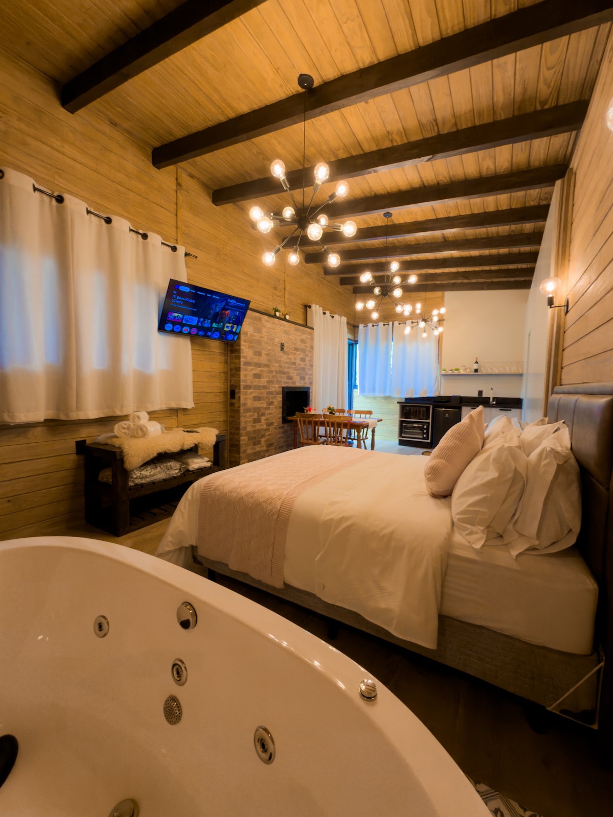 Du wirst die stilvolle Einrichtung dieser charmanten Unterkunft lieben, die mit der Natur mit 5 km in der Innenstadt von Nova Venice SC verbunden ist, über Asphalt findest du einen Wasserbehälter mit 70 m² privatem Raum mit allem Komfort, den du verdienst, Hydromassagebadewanne, Kaffeemaschine, ökologischer Kamin, Klimaanlage, Minibar, Smart-TV, WLAN, Haartrockner auf einer großen Terrasse, um sich für zwei Personen auszuruhen oder in einer Familie zu genießen. Komm und lebe diese magische Umgebung.