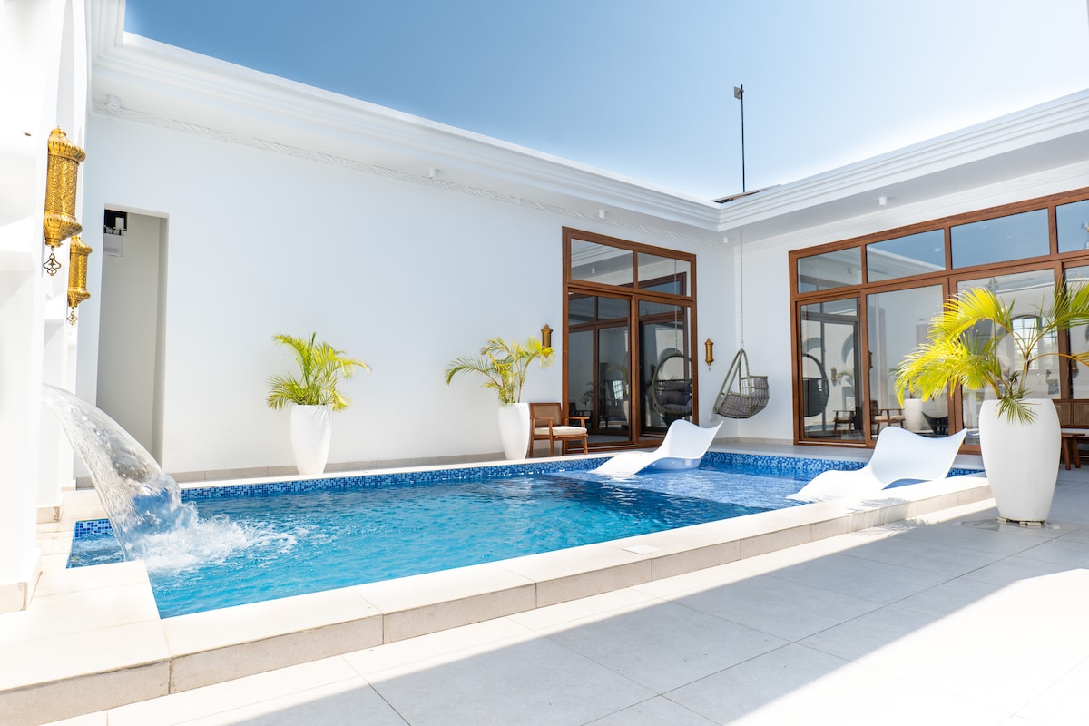 Lions Luxury Villas Sansibar bietet seinen Gästen einen luxuriösen Rückzugsort, Eleganz und Komfort. - Exklusiver Zugang zum Strand: Das Gefühl des Sandes unter den Füßen wird Ihnen sofort das Gefühl geben, im Urlaub zu sein. - Privater Garten: Entspannen Sie sich unter den verführerischen Schatten der Palmen. - Exklusiver Pool: ein privater Infinity-Pool, der die Möglichkeit bietet, sich unter der äquatorialen Sonne abzukühlen.