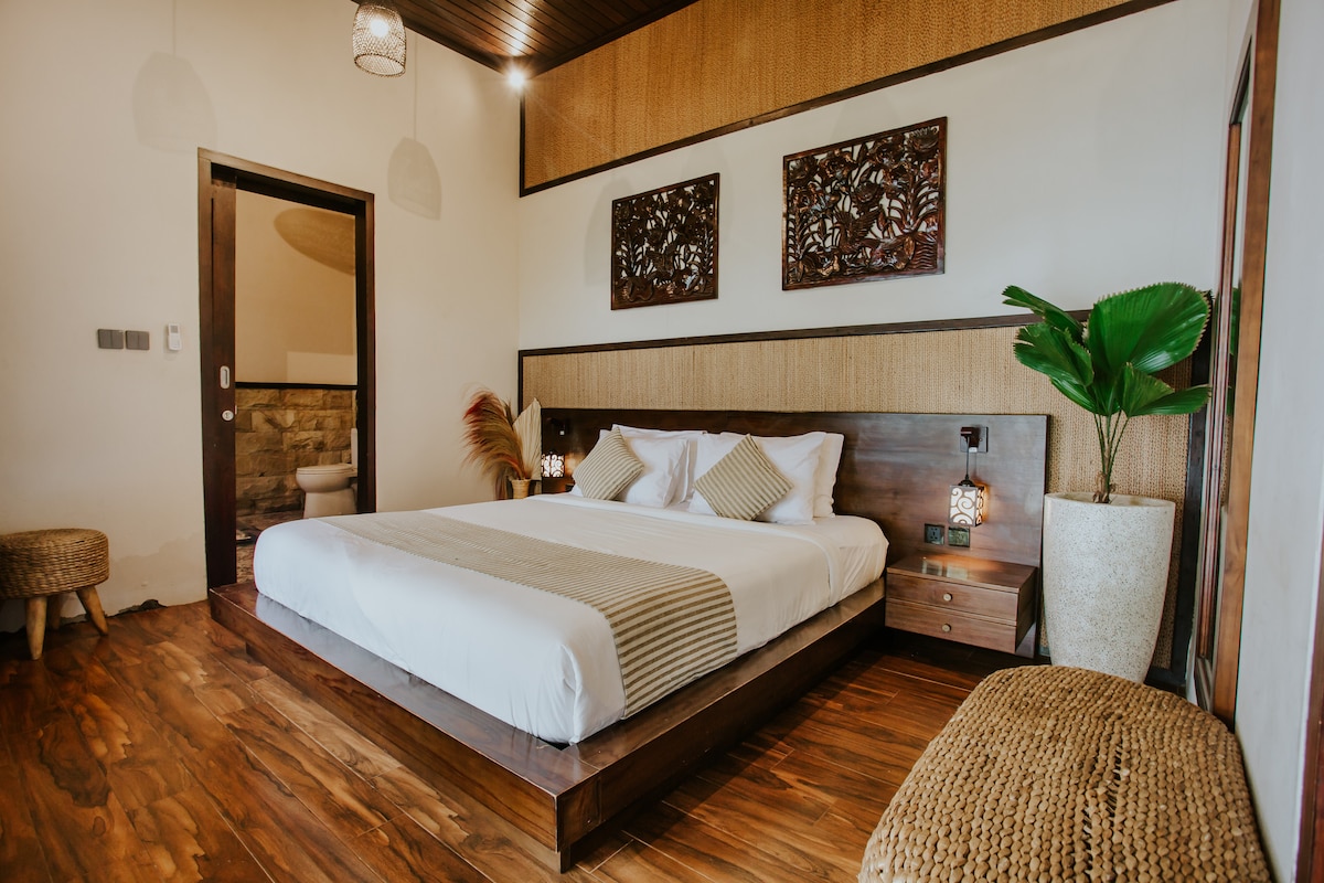 Entfliehe in unsere Poolvilla am Strand, wo jeder Sonnenaufgang und Sonnenuntergang den Himmel in schönen Farbtönen färbt. Genieße die majestätische Präsenz des Bali-Vulkans aus der Ruhe deines Bettes mit dem Meeresrauschen als entspannende Hintergrundmusik. Entspanne dich in der komfortablen Balkonbadewanne mit atemberaubendem Meerblick und genieße die Exklusivität des privaten Strandzugangs.