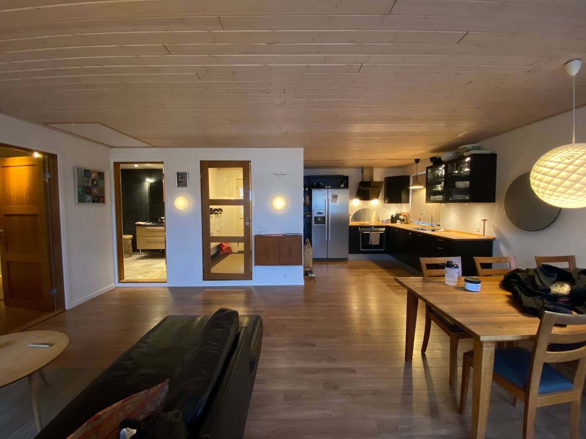 Genießen Sie Ihren Urlaub in einer einzigartigen, neu gebauten Wohnung mit dem besten Blick auf den Nuuk-Fjord. Genießen Sie den Sonnenuntergang und sehen Sie das Nordlicht von der Wohnung aus. Sie liegt in einer ruhigen und gemütlichen Gegend im alten und ikonischen Stadtteil "Myggedalen". Sie ist nur wenige Gehminuten vom Kolonialhafen und dem Stadtzentrum entfernt. Die geräumige Wohnung verfügt über ein gemütliches Wohnzimmer mit großem Fernseher und eine voll ausgestattete Küche. Das Schlafzimmer verfügt über ein Doppelbett und im Wohnzimmer befindet sich ein großes und bequemes Schlafsofa. Die Wohnung teilt sich den Eingang mit einer kleinen Bürogemeinschaft.