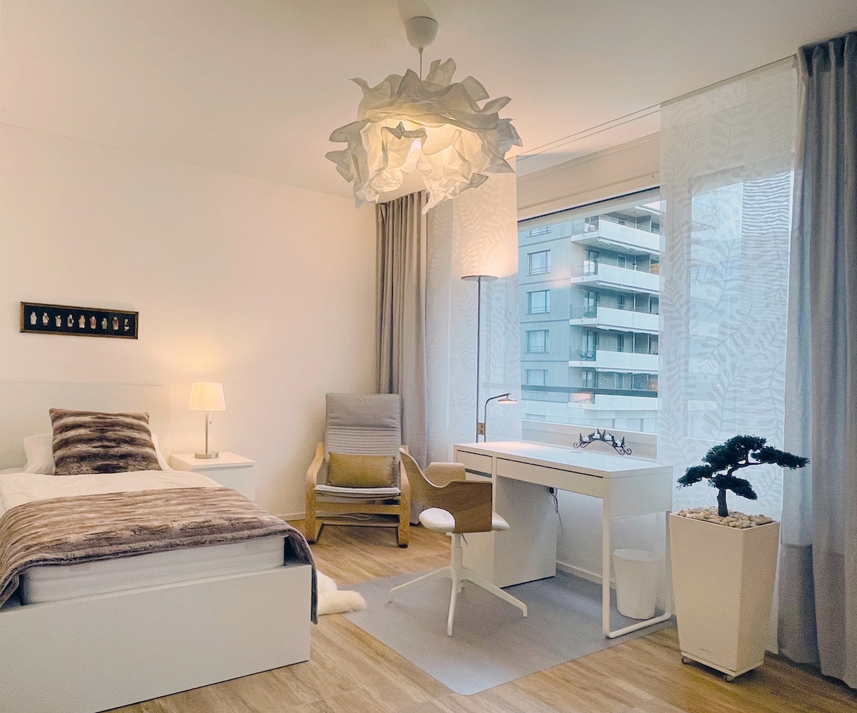 Die Einrichtung ist hell, modern und gemütlich. Der Schlafbereich verfügt über ein Doppelbett (180x200 cm). Der Arbeits- und Essbereich ist hell und mit Blick in den Vorgarten. Der kleine Sitzplatz ist zur alleinigen Benutzung. Das Studio liegt zentral in der Stadt. In Sichtweite zum Studio befindet sich die Bahnlinie. Die Züge fahren langsam, sind aber hörbar. Ab Mitternacht fahren keine Züge mehr und die Nachtruhe ist gewährleistet.
