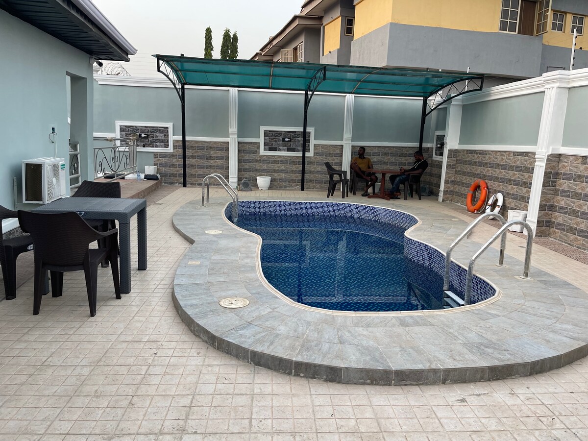 Dieses luxuriöse Apartment mit 4 Schlafzimmern und 5 Badezimmern im Herzen von Abeokuta bietet die perfekte Mischung aus Komfort und Eleganz.Jedes Schlafzimmer verfügt über ein eigenes Bad, sodass Sie während Ihres Aufenthalts Privatsphäre genießen.Der Wohnbereich ist gemütlich und gleichzeitig stilvoll, und die Unterhaltungsmöglichkeiten machen es schwer, ihn jemals wieder verlassen zu wollen.Genießen Sie Billard, Fußball und PS5 für grenzenlosen Spielspaß.Mit unbegrenztem WLAN, einem Generator und einem Wechselrichter bleiben Sie immer in Verbindung.Dieses Apartment bietet alles, was Sie für einen unvergesslichen Aufenthalt in Abeokuta benötigen.