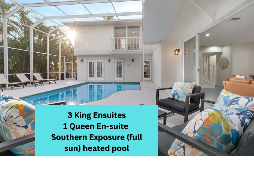 Tropical Oasis Downtown Naples 3 BD/2 BA full house w/ a HEATED pool, outdoor entertaining, BBQ grill, lanai seating/dining for 8, outdoor games, 2 living rooms w/ large TVs (main room has a 75" screen TV), master suite w/ ensuite bathroom & flatscreen TV, all 3 bedrooms have king beds. Close to downtown restaurants/shopping (9 min), beaches/Naples Pier (14 min). DOG POLICY: Only after owner's approval, a non-shedding small dog is allowed with $100 per dog non-refundable fee (2 dog maximum).