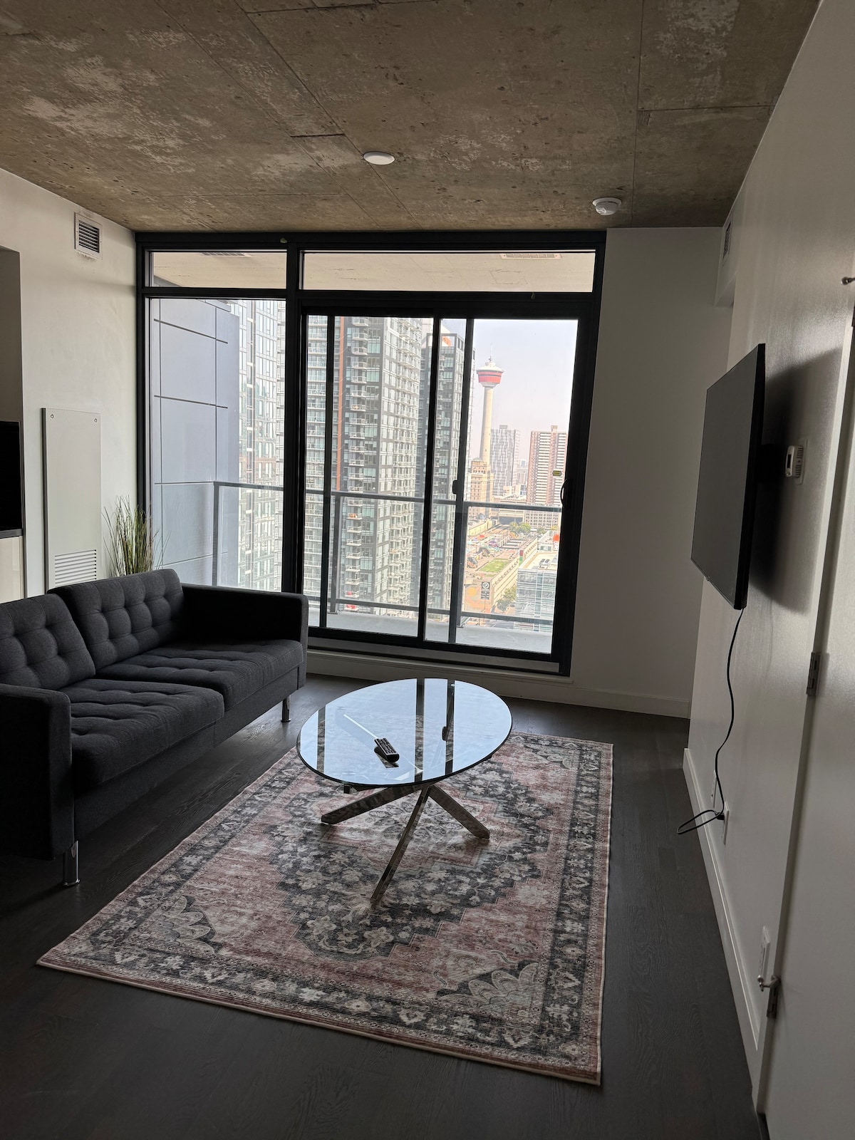 About this space This beautiful 1 bed and 1 den apartment is your home away from home. It offers all the convenience and comfort you need to make your trip memorable and comfortable Modern living space with floor to ceiling window that lets in plentiful and beautiful natural light, and offers amazing views of Downtown Calgary and Rocky Mountains in the distance Unbeatable location offers exceptional convenience to amenities and entertainment experiences. It's close to all public transportations.