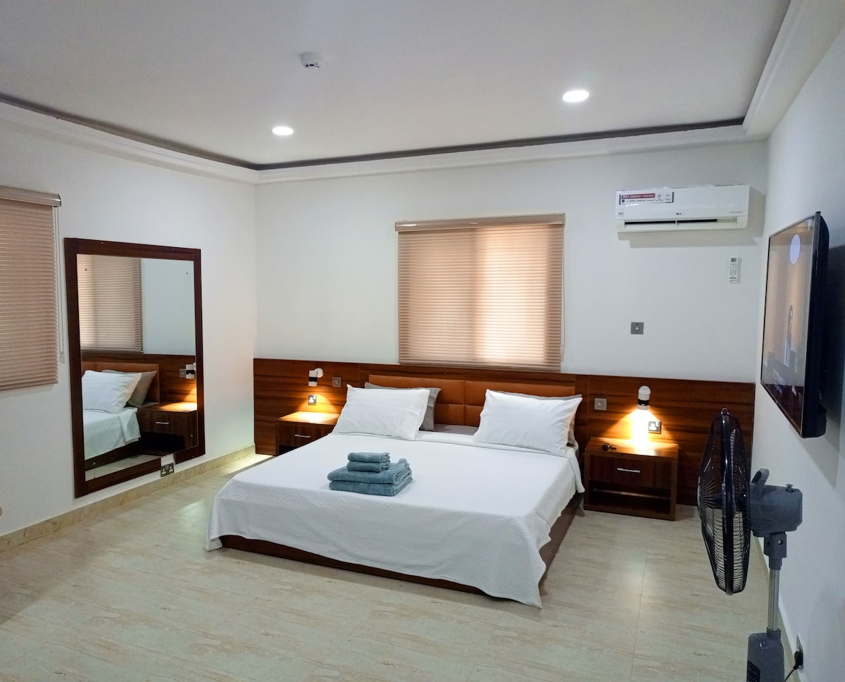 Willkommen in unserer charmanten, sehr geräumigen 1-Zimmer-Wohnung im Herzen des pulsierenden Ibadan! Ideal für Alleinreisende oder Paare, die Komfort und Bequemlichkeit suchen. Das Apartment verfügt über ein gut ausgestattetes Schlafzimmer mit einem weichen Kingsize-Bett. Der Wohnbereich ist geschmackvoll eingerichtet, sehr geräumig für Entspannung, komplett mit einem Smart-TV und Highspeed-WLAN. Eine voll ausgestattete Küchenzeile ermöglicht die einfache Zubereitung von Mahlzeiten. Unsere Wohnung verspricht einen unvergesslichen Aufenthalt . Wir freuen uns darauf, dich bei uns bei