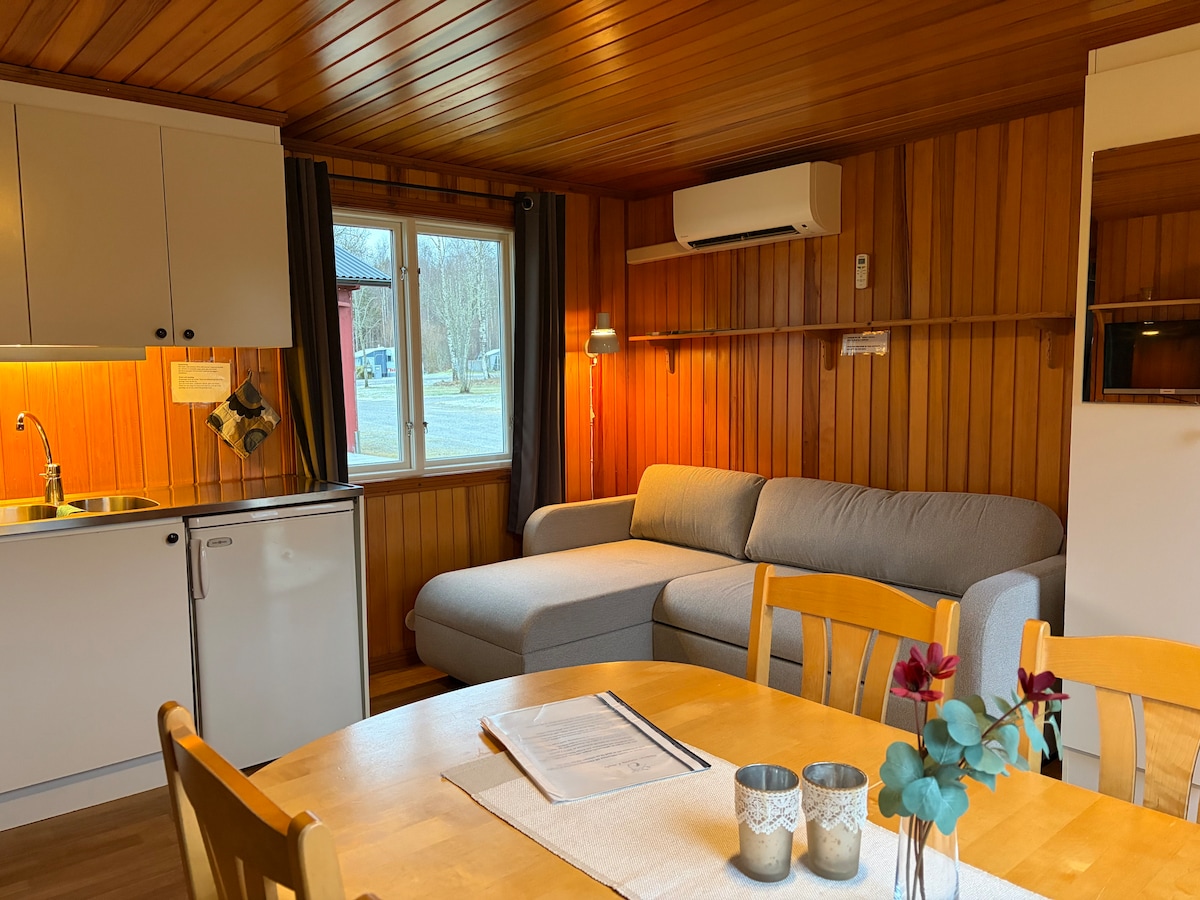 Großes Loft-Cottage zur Selbstverpflegung von 40 km2 mit 6-8 Betten. Tier erlaubt. Bettwäsche und Verbrauchsmaterialien sind inbegriffen. Endreinigung und Bettwäsche können beim Gastgeber gemietet werden. Hinweis: Im Voraus bestellt. Das Hotel liegt am Rande kleinerer Camping im Landesinneren in einer hügeligen Umgebung. Neben Kungsbygg und Vallåsen. In der Gegend gibt es weniger Angel- und Badeseen. Aktivitäten im Sommer wie Fußballgolf, Bouleplatz, Fußballplatz und großer parkähnlicher Bereich mit vielen Wanderwegen. In der Umgebung kannst du eine Sauna oder einen Whirlpool mieten.