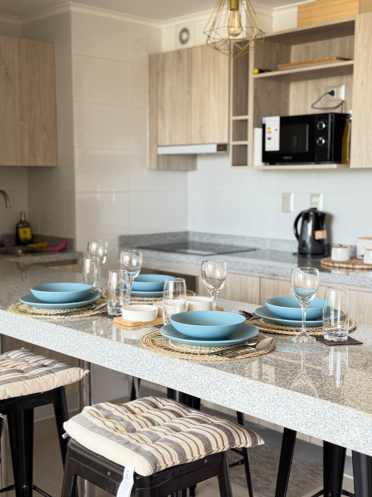 Departamento ubicado a una cuadra del casino y supermercado, diseñado para tu comodidad, cocina totalmente equipada ádemas incluimos desayuno continental para 2 personas, Cama king extra cómoda, Smart TV, Sofa cama, Wifi y un balcón privado. Perfecto para viajes de parejas, familias o negocios!☀️ Reserva ya y crea tus propias historias!♡