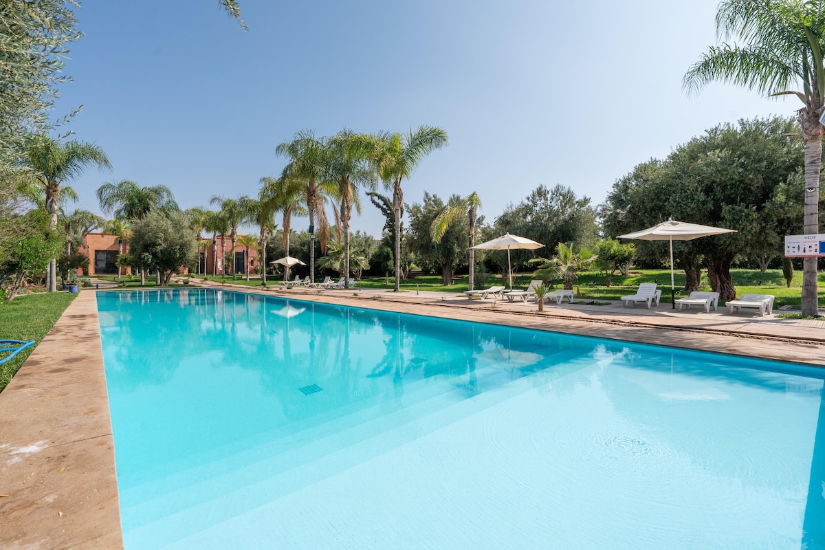 Tritt ein in die luxuriöse 3BR 3Bath-Villa eingebettet in die bezaubernde West Palmeraie von Marrakesch. Dieses versteckte Juwel bietet einen ruhigen Zufluchtsort aus der pulsierenden Stadt, während es immer noch nur 15 Minuten vom Zentrum, aufregenden Sehenswürdigkeiten und historischen Sehenswürdigkeiten entfernt ist. ✔ 3 komfortable Schlafzimmer ✔ Open Design Living ✔ Voll ausgestattete Küche ✔ Innenhof (Pool, Lounges, Restaurants) ✔ Obere Terrasse ✔ Smart-Fernseher ✔ High-Speed-WLAN ✔ Klimaanlage ✔ Arbeitsbereiche ✔ Hotelausstattung (Pool, Spa, Restaurant, Parkplatz) Mehr dazu weiter unten!