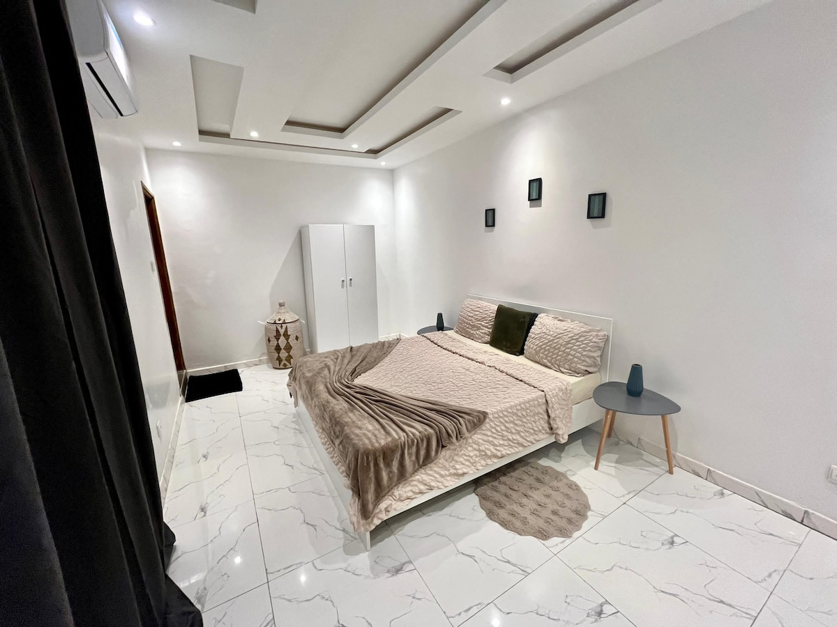 Détendez-vous dans ce logement calme, élégant et entièrement équipé, parfait pour un séjour confortable à Dakar. Chaque espace a été pensé pour offrir un maximum de confort, que vous soyez en déplacement professionnel ou en vacances. Le studio est décoré avec goût, doté de tout le nécessaire pour se sentir immédiatement chez soi : lit confortable, cuisine moderne, climatisation, Wi-Fi rapide, et Smart TV. Profitez d’un cadre paisible et sécurisé, à proximité de toutes les commodités.
