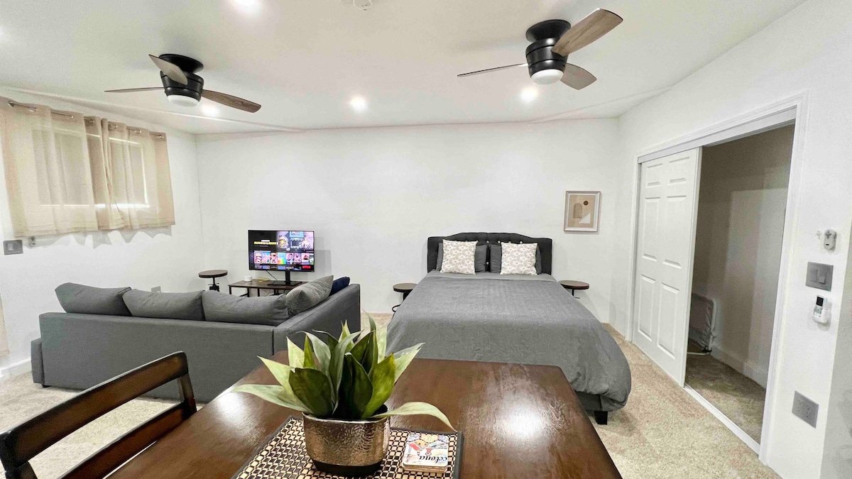Suchst du nach einer privateren und gemütlicheren Unterkunft? Erlebe eine versteckte Ecke mit luftigem Designer-Dekor. Diese private Studio-Wohnung ist ein luxuriöser Raum, der mit Smart-Home-Funktionen und -Geräten, ausgewiesenen Parkplätzen, einem privaten Eingang, einer Klimaanlage und einem eigenständigen Check-in ausgestattet ist. Versteck dich vor dem Alltagsstress in einer perfekten Stadt inmitten der Natur, gemütlicher Restaurants und Designer-Einkaufsmöglichkeiten. Verkehrsmittel durch den Metrolink und Amtrak sind nur ein paar Häuserblocks entfernt.