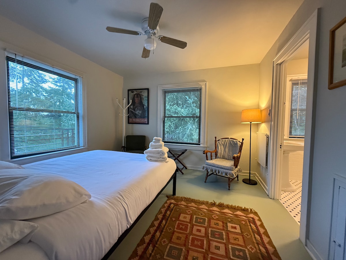Agnes' Zimmer im Twin Gables Inn, Skamokawa, WA, ein traditionelles Bed & Breakfast seit 2007. Das Zimmer mit Blick auf Skamokawa Creek, Queensize-Bett, Aufbewahrungskiste, Duschbad. Kaffee wird eine Stunde vor der Frühstückszeit deiner Wahl vor dein Zimmer geliefert. Volles Frühstück inklusive. Kostenloses WLAN. Twin Gables ist fünf Gehminuten vom Vista Park am Columbia entfernt, auch unserem örtlichen Redmen Hall Museum und Buchladen. Maximale Belegung 2 Erwachsene. Keine Haustiere.