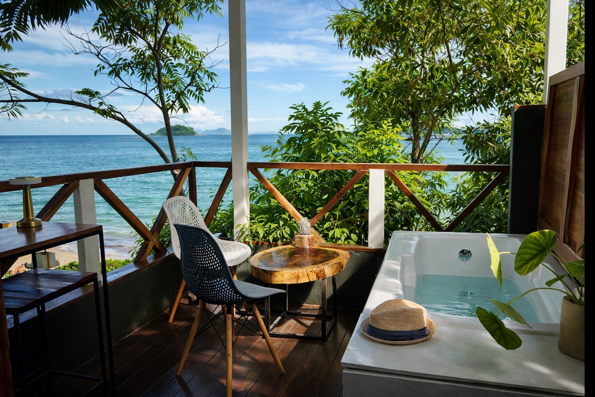 Am Strand mit direktem Zugang zum Meer. Studio mit offenem Raum für 2 Personen. Wohnzimmer / Küche / Schlafzimmer 1 (Queen) / Sofa / Sessel / Badezimmer mit Dusche, eigener Arbeitsbereich. Große, spektakuläre Terrasse am Golf mit Badewanne, die in ein Sofa umgewandelt werden kann. Komfortabel, elegant, ruhig und sicher. Großer und frischer, von Bäumen gesäumter Garten mit tropischer Fauna und Flora. Kolibris, Leguane, manchmal Affen und Faultiere usw. ... Fitnessgeräte, kleiner Pool. Perfekt, um deine Batterien aufzuladen.