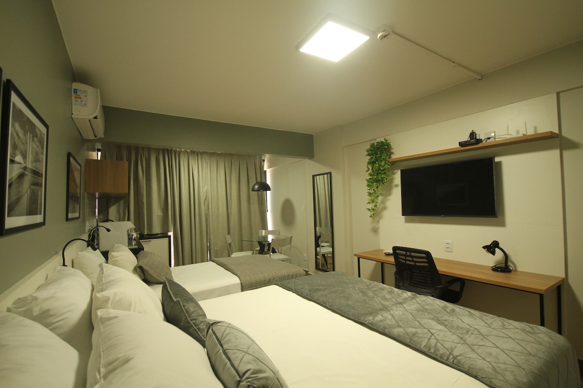 Suíte de 28m², com cama de casal, TV led 32, ar condicionado, cortina blackout, home office com cadeira de escritório, Wi Fi, guarda-roupas, criado mudo, mesa de refeições com 2 cadeiras, cozinha americana (pia, geladeira, micro ondas, cafeteira elétrica, pratos, copos e talheres) banheiro com chuveiro (toalhas, sabonetes e papel higiênico inclusos). Serviço de arrumação de quartos.