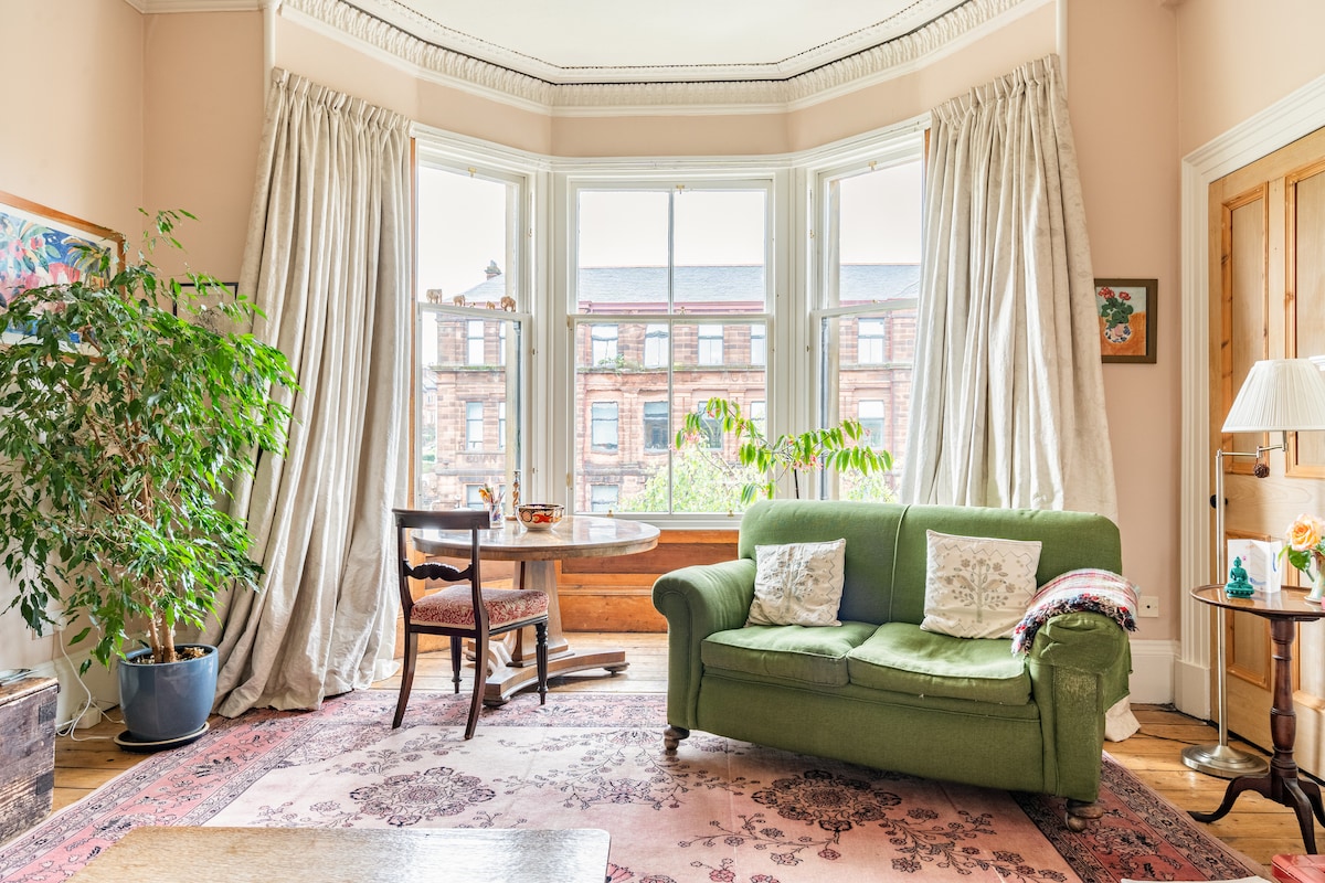 Fantastische, ruhige Lage im Herzen von Kelvinbridge, nur wenige Gehminuten vom Park, der Universität, der Kunstgalerie und den Geschäften, Cafés und Restaurants des West End entfernt. Erdgeschoss eines Reihenhauses aus den 1870er Jahren in Glasgow, Großes Wohnzimmer – offenes Feuer, Esstisch. Ausgestattete Küchenzeile – Kühlschrank, Eisbox, Cafetiere. Großes, sonniges Schlafzimmer, Kaiserbett, Baumwollbettwäsche, Naturmatratze, schwere Vorhänge. Pflanzengefülltes Badezimmer, freistehende Badewanne, ebenerdige Dusche. Schnelles WLAN. 50-Zoll-Fernseher. Alexa Musik. Heizungssteuerung