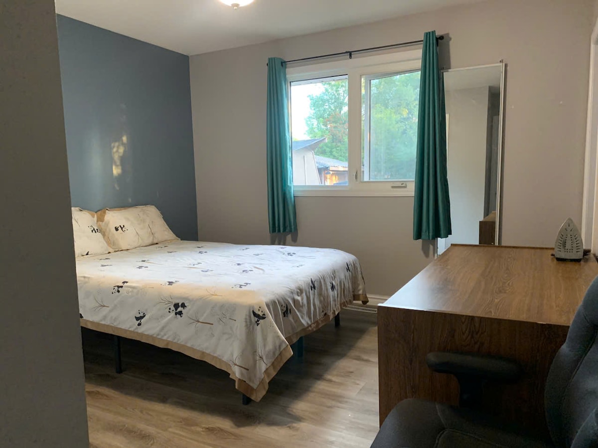 Genieße den Komfort und die Bequemlichkeit, die diese gemütliche Kellersuite in der ruhigen Greens-Gegend bietet. Erlebe in dieser besonderen und familienfreundlichen Villa besondere Momente. Es ist 5 Autominuten von Costco und 8 Autominuten von Walmart und Superstore entfernt. Dieser super saubere Raum verfügt über ein komfortables Queensize-Bett und kostenlose Parkplätze. Sie verfügt über Highspeed-Internetzugang mit 325 Mbit/s WLAN, 40-Zoll-Smart-TV mit Prime Video und Netflix-Zugang. Die Küchenzeile verfügt über Grundausstattung wie Mikrowelle, Kühlschrank, Wasserkocher, Kaffeemaschine und Toaster.