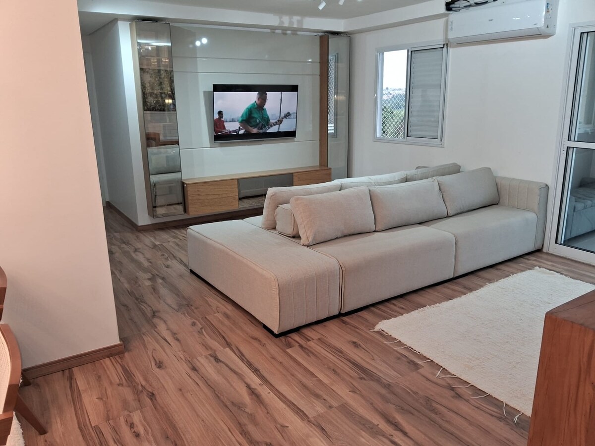 O grupo ficará confortável neste lugar espaçoso e único. Apartamento amplo e luxuoso a 5 minutos do centro de Paulinia com varanda gourmet e sala ampliada, cozinha completa e roupa de cama, localizado dentro de condomínio com toda estrutura com piscina, quadra de futebol, basquete, brinquedoteca, com duas vagas de garagem coberta. O apartamento tem telas em todas as janelas e na varanda o que dá segurança pra crianças.