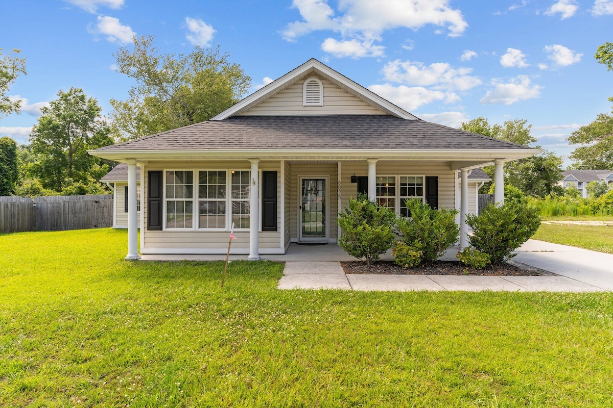 Malerisches Haus in Wohngegend. Zwei Schlafzimmer und zwei Badezimmer. Offener Wohnraum, gut zum gemeinsamen Abhängen! Es gibt auch eine voll ausgestattete Küche und eine Waschküche. Eingezäunter Hof für Haustiere zum Spielen. Es ist 7 Meilen zum Strand und nur wenige Minuten von Einkaufsmöglichkeiten und Restaurants entfernt. Die Nachbarschaft ist familienfreundlich. Es ist üblich, Erwachsene und Kinder beim Sport, beim Gassigehen mit Haustieren und beim Fahrradfahren zu sehen. 15 Minuten zum Wrightsville Beach 15 Minuten bis zum historischen Viertel von Downtown Wilmington