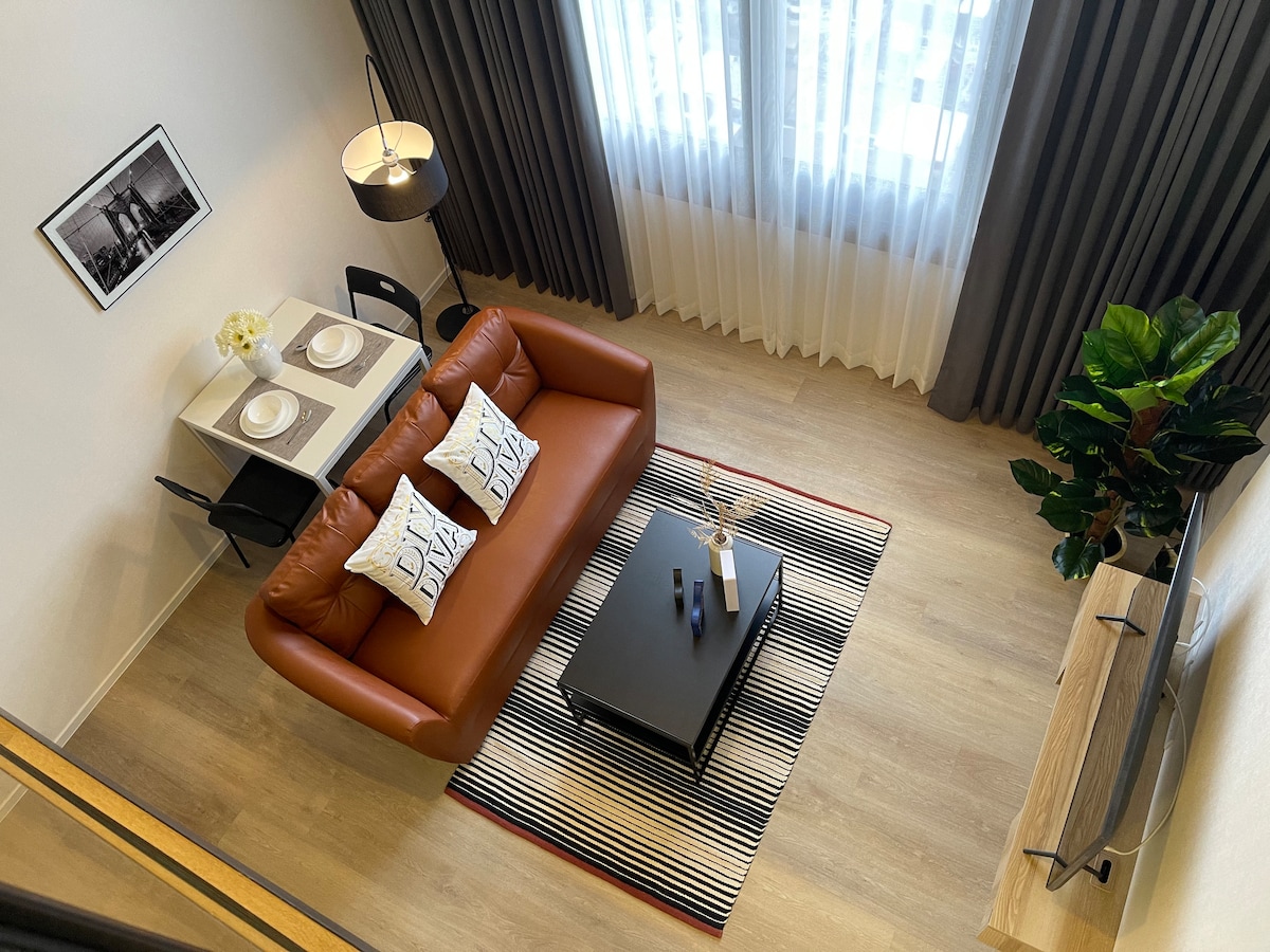 62 m2 Loft im Herzen von Bangkok, Sukhumvit Road soi 8: - 1 Zimmer mit Kingsize-Bett, L-förmiges Sofa, großem Schreibtisch, Schränken und Schminktisch. - 1 Badezimmer - 1 private Terrasse - 1 Waschmaschine mit Wäscheständer - 1 Kochnische - Esstisch und Stühle Das Hotel liegt im Erdgeschoss einer Villa in einem Wohngebiet und im Herzen von Sukhumvit 250 m vom schönsten Park Bangkoks Benchakitti & Forest Park Sehr gute Restaurants auf der Straße 600 m von BTS Nana und Sukhumvit Road