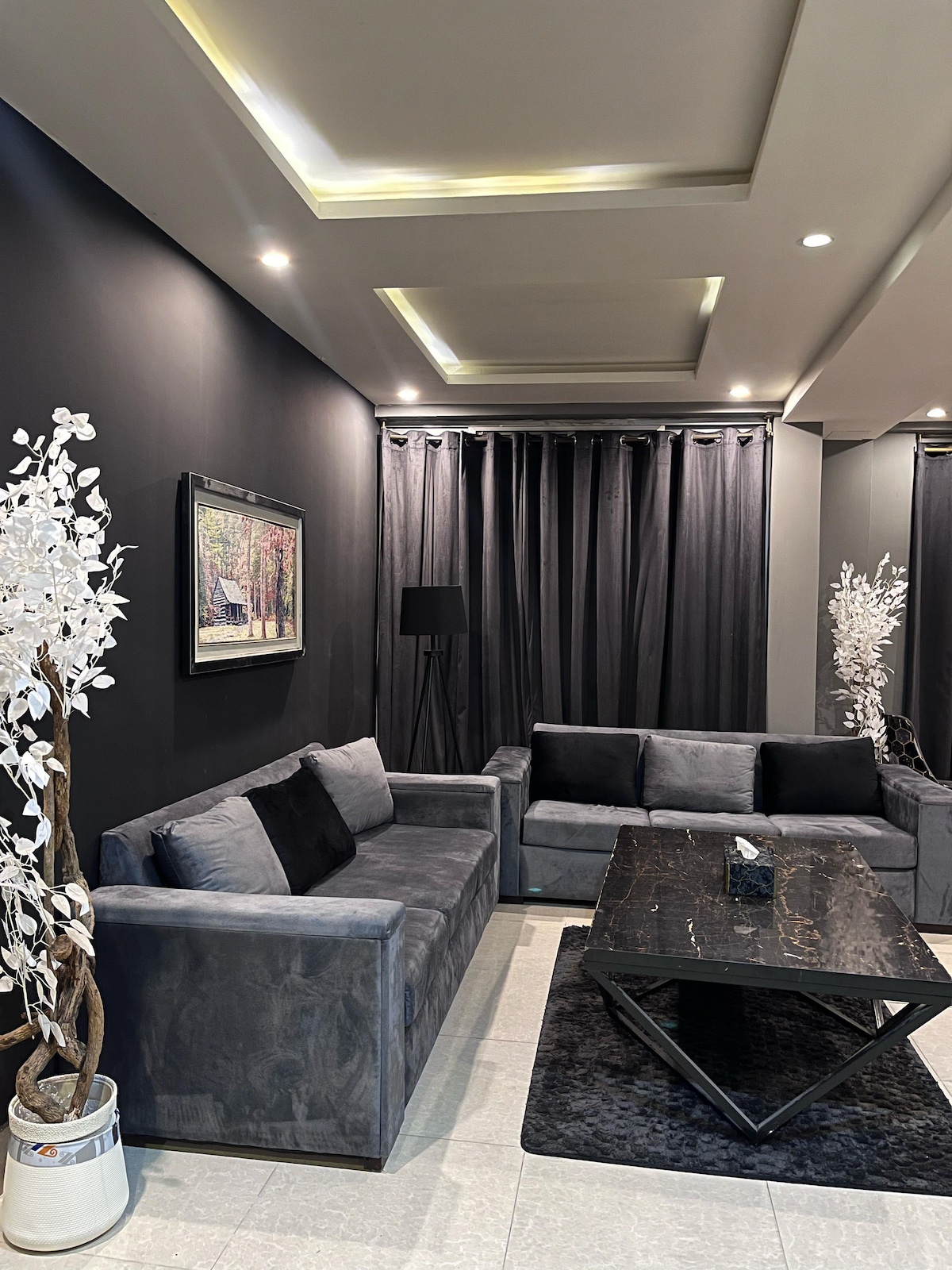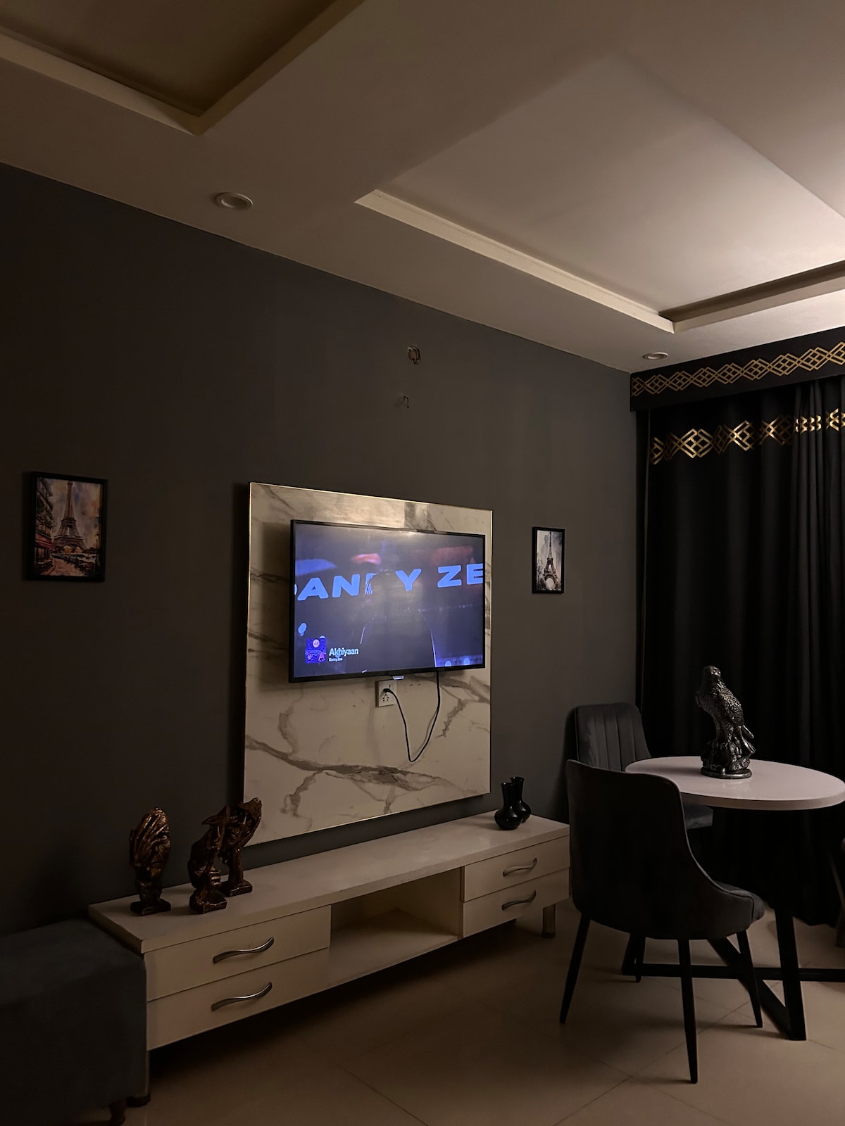 Experience a designer crafted apartment built for comfort and style. Located in a peaceful, secure area, it features a private terrace with beautiful views, a plush bed, 55 inch TV with Netflix and elegant lighting. The fully equipped kitchen includes a German stove, big fridge to store your snacks , kettle and LG washer. A unique monarch modern theme, mural wallpaper and premium décor create a perfect space to relax and enjoy your stay